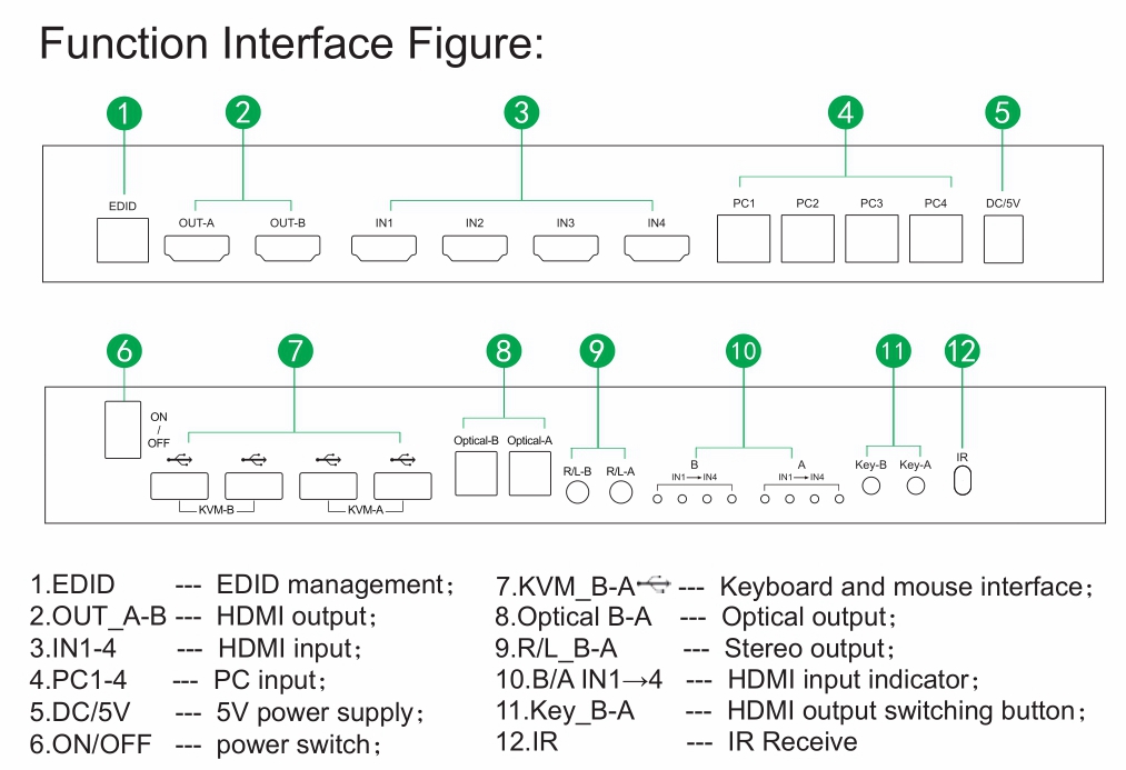 - Support 2 HDMI audio extraction, 3.5mm earphone jack and optical fiber interface output at same time
