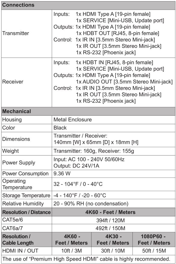 - Input and output video resolution is up to 4k2k@60Hz 4:4:4, extends distance up to 394ft / 120 meters via a single CAT5e/6 cable (Using CAT6a/7 cable extends up to 492ft / 150M)