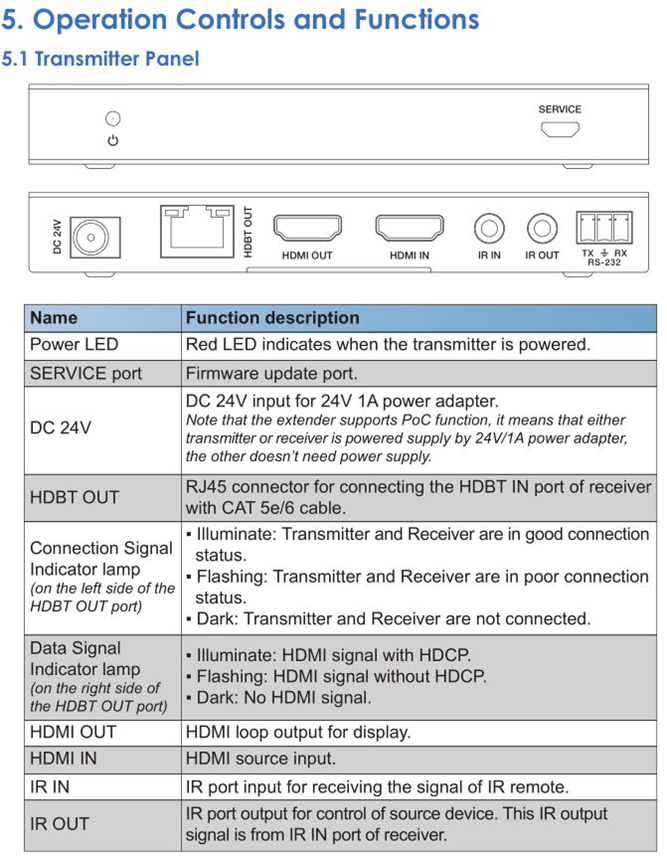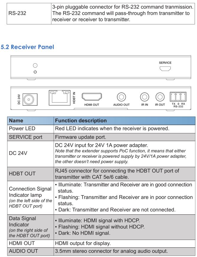 - Supports PoC (Power over Cable) function, which means that either transmitter or receiver is powered by 24V/1A power adapter, the other doesn't need power supply