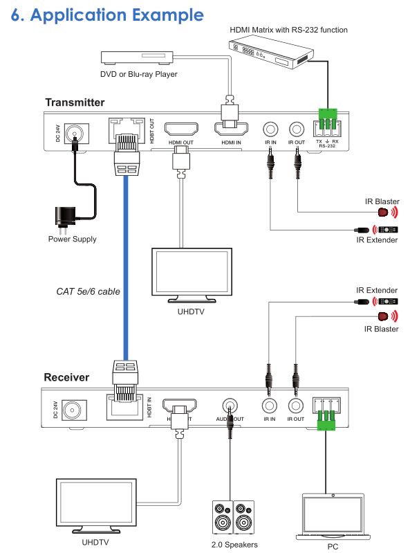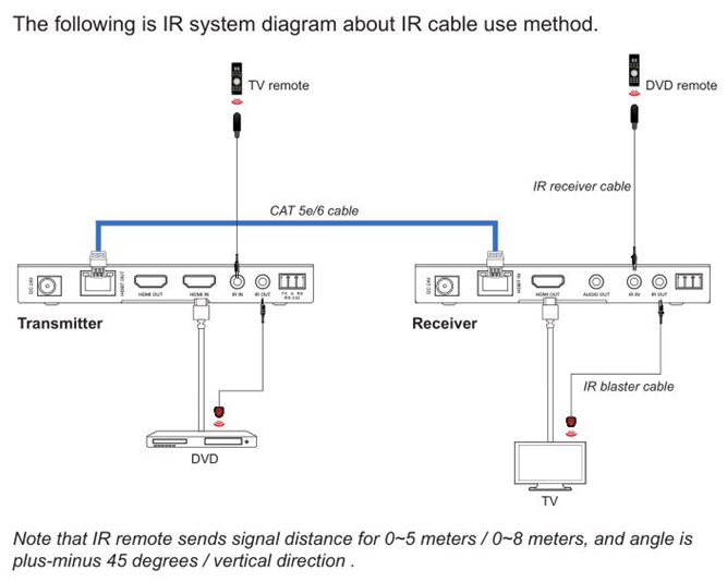 This HDMI extender includes two units: transmitter unit and receiver unit. The transmitter unit is responsible for catching HDMI input signal and carries the signal via one cost effective Cat5e/6 cable, and transmitting / emitting IR control signals. The receiver unit is responsible for receiving the HDMI signal and transmitting / emitting IR control signal.
