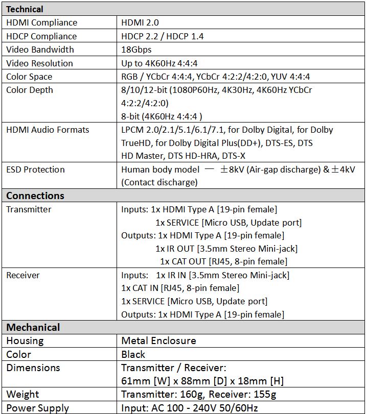 The HDMI 18Gbps Extender can extend high definition video / audio signal and one-way IR, and the distance is up to 164ft/50m between transmitter and receiver over a single Cat5e/6 cable. It supports resolution up to 4K 2K@60Hz 4:4:4, 18Gbps and HDCP 2.2. In addition, the extender is equipped with one-way IR pass-through which allows for source control and one HDMI loop output.