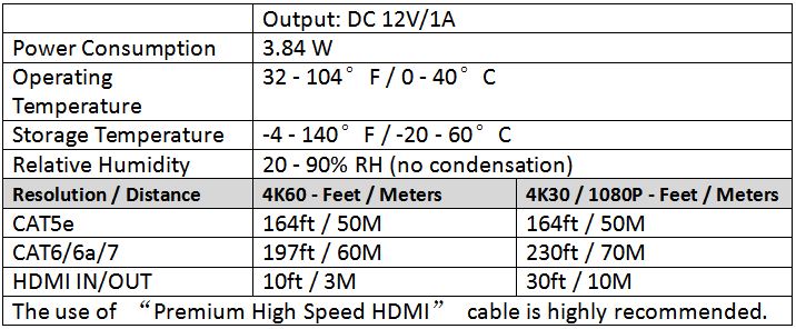- Supports input and output video resolution up to 4k 2k@60Hz 4:4:4, extends distance up to 164ft / 50 meters