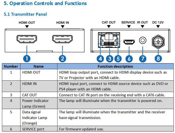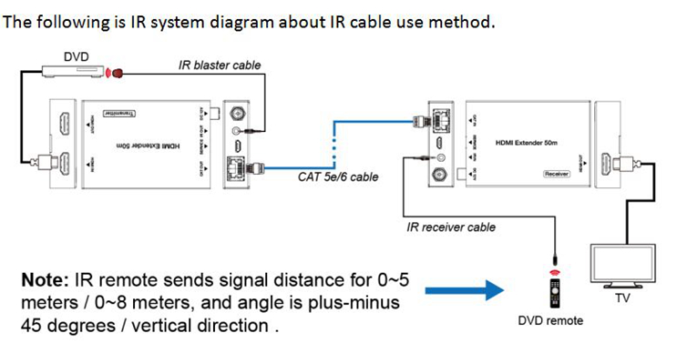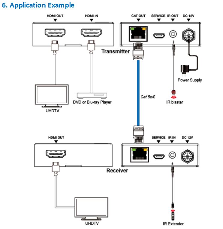 The extender includes two units: transmitter and receiver. The transmitter unit is responsible for catch HDMI input signal and carries the signal via one cost effective Cat6 cable, and emitting IR control signals. The receiver unit is responsible for receiving the HDMI signal and transmitting IR control signal.