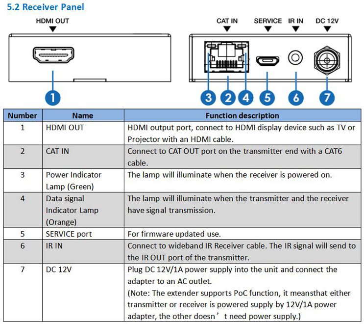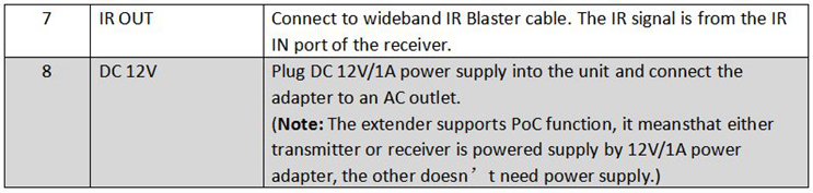 - Supports PoC (Power over Cable) function, which means that either transmitter or receiver is powered by 12V/1A power adapter, the other doesn't need power supply