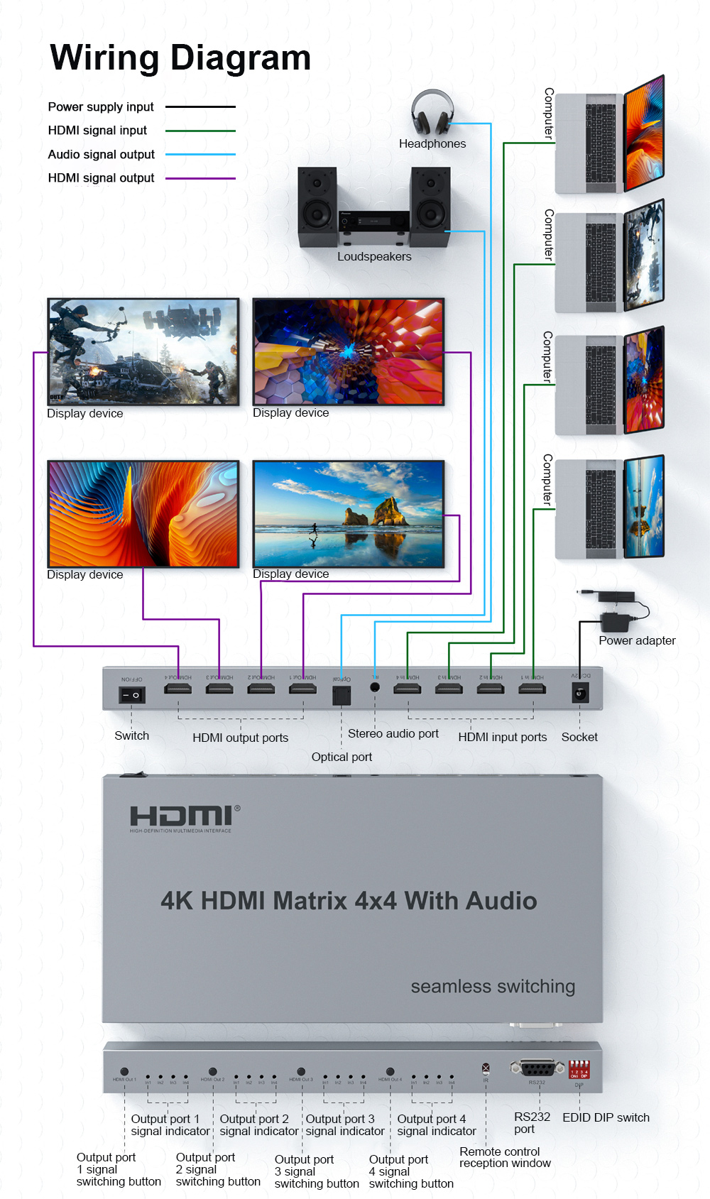 4K HDMI Matrix 4x4 with Audio (Seamless Switching) for Set-top Box Computer Display Device Projector