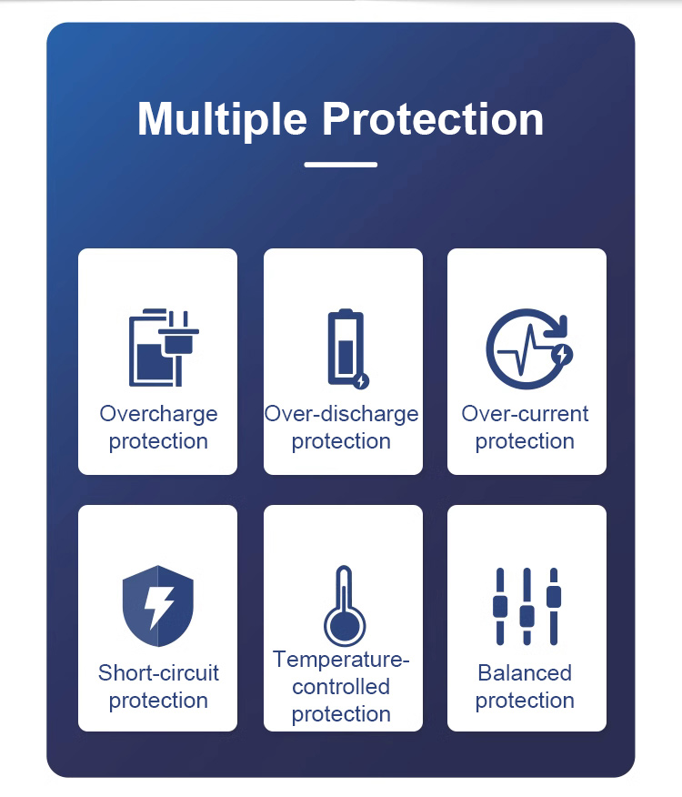 - Multiple protections: Overcharge, over-discharge, over-current, short-circuit, temperature-controlled and balanced protection