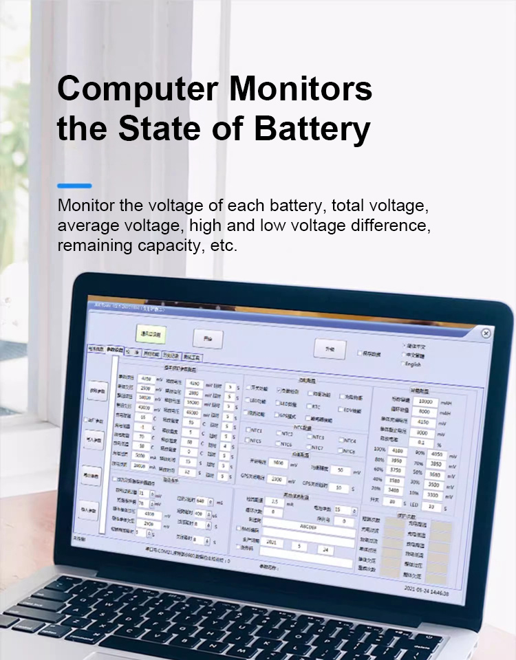 - Host computer monitors the state of battery use: Monitor the voltage of each battery, total voltage, average voltage, high and low voltage difference, remaining capacity, etc.