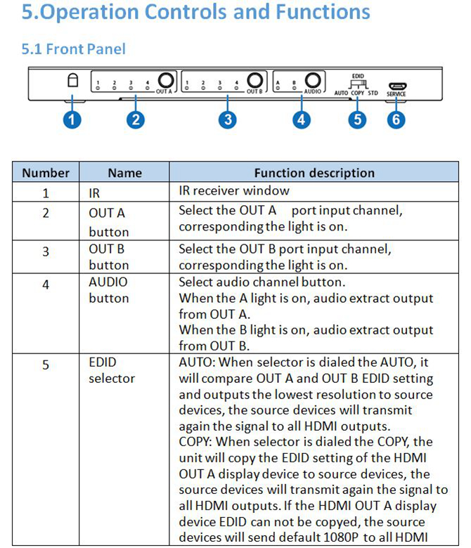 - EDID can be selected AUTO, COPY and STD mode via selector on panel.