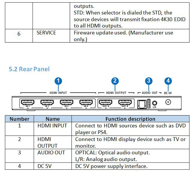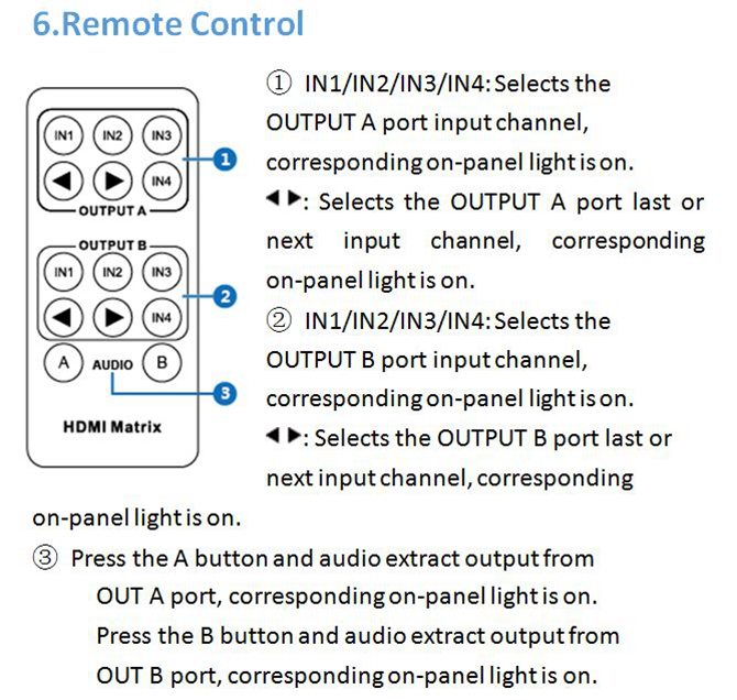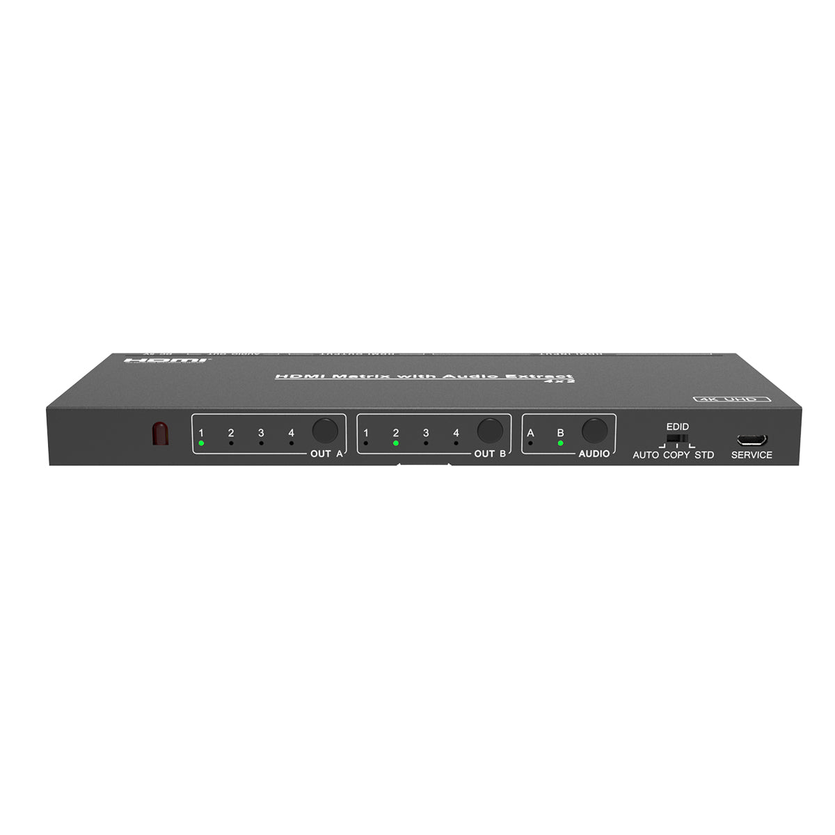 The 4x2 HDMI Matrix simultaneously four routes HDMI sources to two HDMI displays. It supports resolution up to 4K2K@50/60Hz YCbCr 4:2:0 and HDCP 2.2. This product supports audio extract from output A or output B port to optical and analog output and can be selected AUTO, COPY and STD modes EDID control. It features flexible control through on-panel buttons, IR remote control.