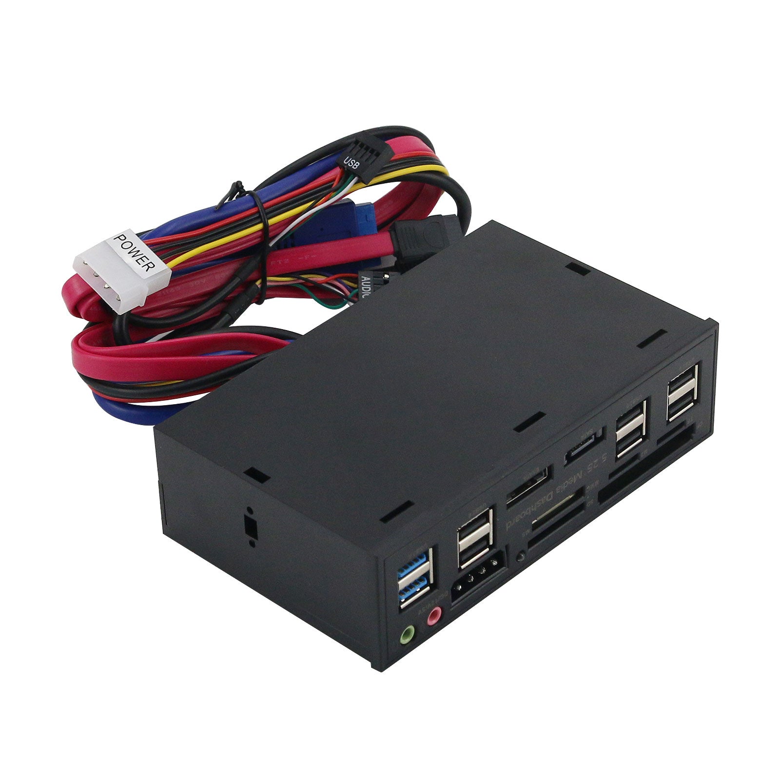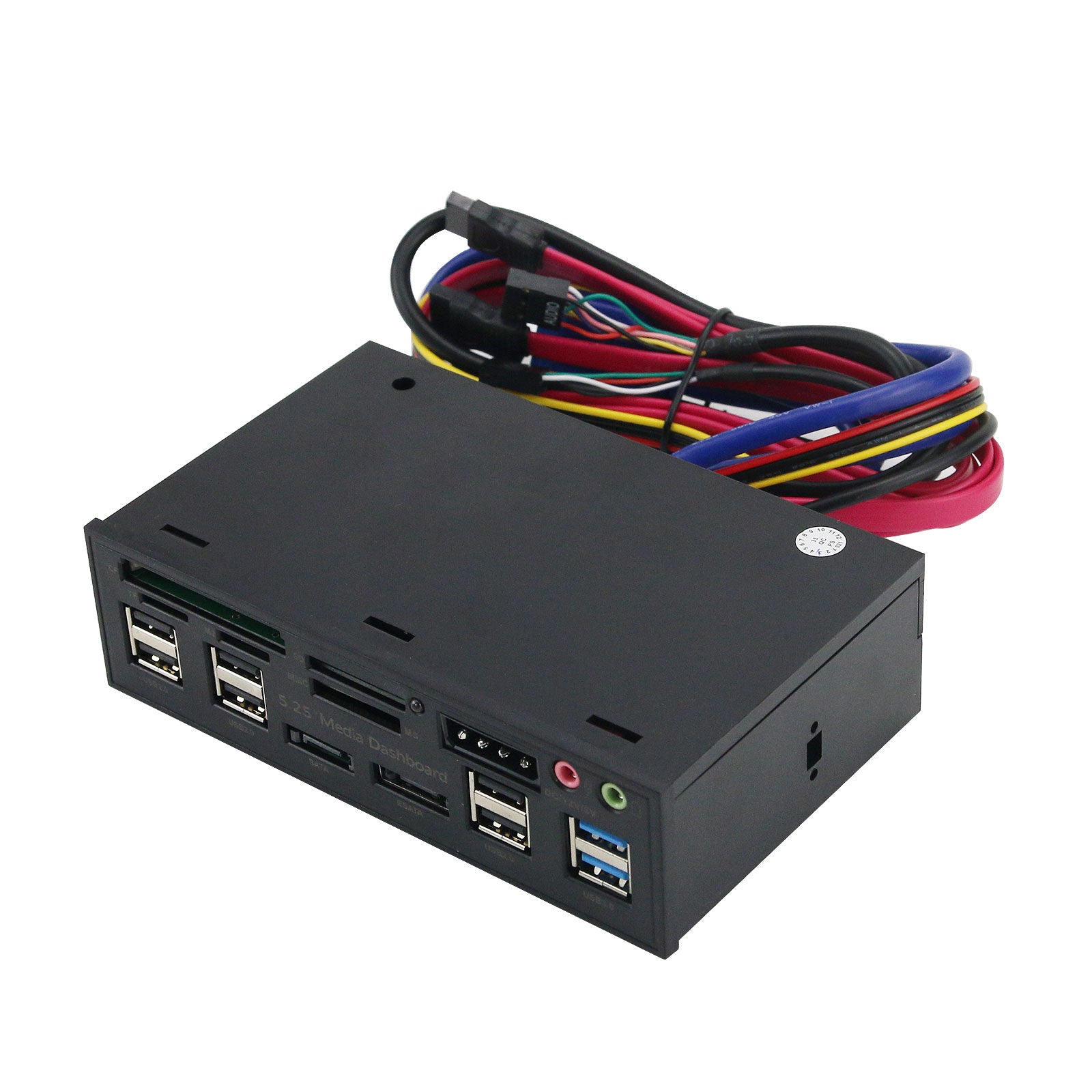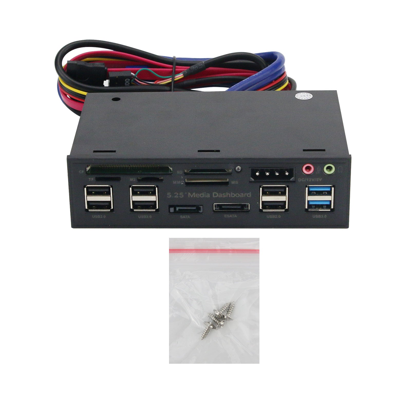 - 5.25inch Media Dashboard Front Panel USB3.0 + 3 port USB 2.0 HUB + eSATA + SATA +M2/TF/SD/MMC/MS/CF Audio Multi Card Reader for Computer Case Optical Drives Bay.