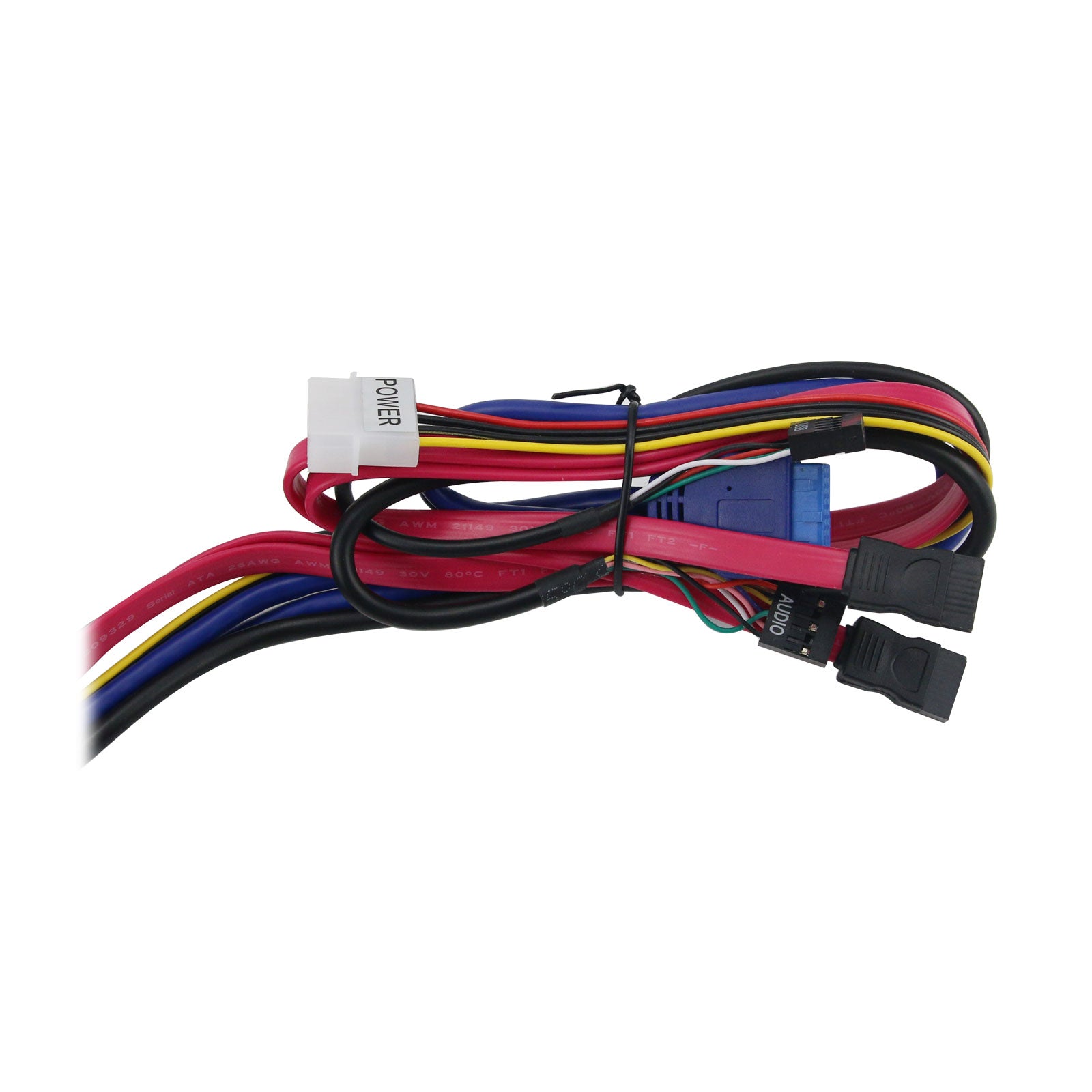 10. Connect the motherboard interface: 1 20PIN 3.0 cable, 1 large 4PIN power cable, 1 DuPont USB2.0 cable, 2 SATA data cables, 1 AUDIO cable.