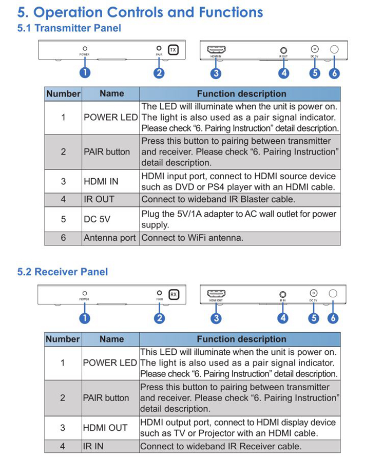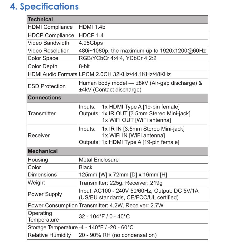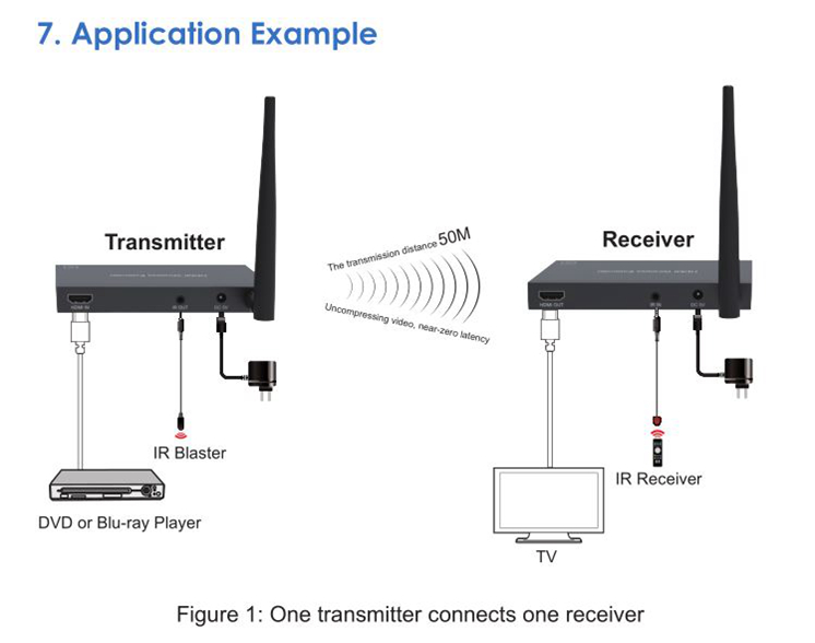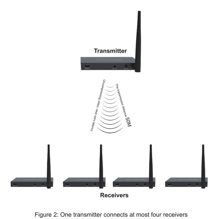 This product is based on H.264 standard solution for distributing one HD content to multiple HD display devices. It extends distance the furthest up to 164ft/50m between transmitter and receiver via wireless transmission (An open environment without Wi-Fi interference). It offers high quality configurable, low-bandwidth H.264 compression video supporting resolution up to 1920×1200@60Hz. The Wireless product is designed specifically to transmitting high definition video & audio within one room.