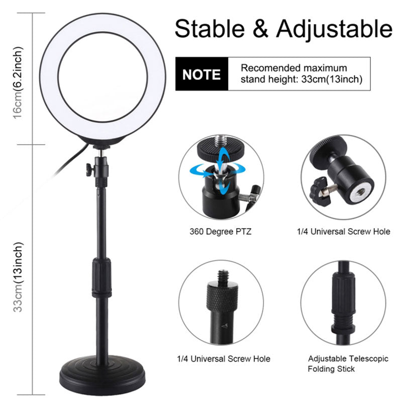 6.2" Dimmable LED Ring Fill Light + Desktop Tripod Stand Round Base Adjustable Height 18-28cm PU392