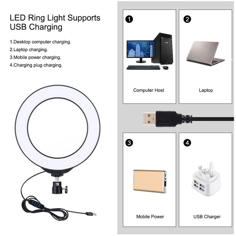5. The USB ports can be used with multiple devices, such as connect computer host, laptop, mobile power and USB charger. You will be able to enjoy LED ring light at any time free.