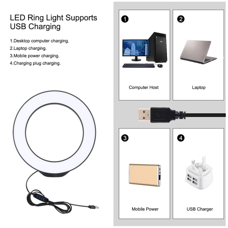 5. The USB ports can be used with multiple devices, such as connect computer host, laptop, mobile power and USB charger. You will be able to enjoy LED ring light at any time free.