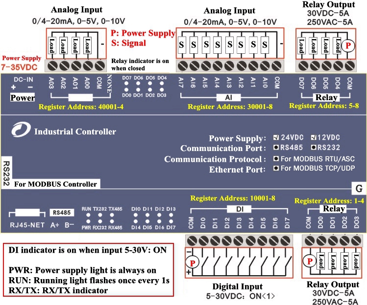 - Contact capacity: normally open relay: 5A/250VAC, 5A/30VDC