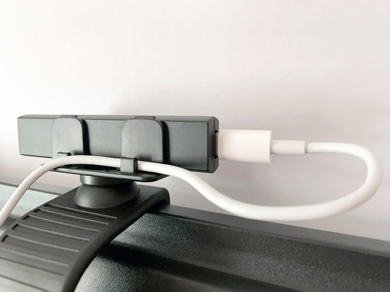 - Use the attached connecting line to connect the Aimxy Z device with the computer. In order to ensure the stable placement of the device, wrap the connecting line inserted from the side of the device back and clip it into a line card behind the base bracket, and then turn the connecting line back out to naturally sag.