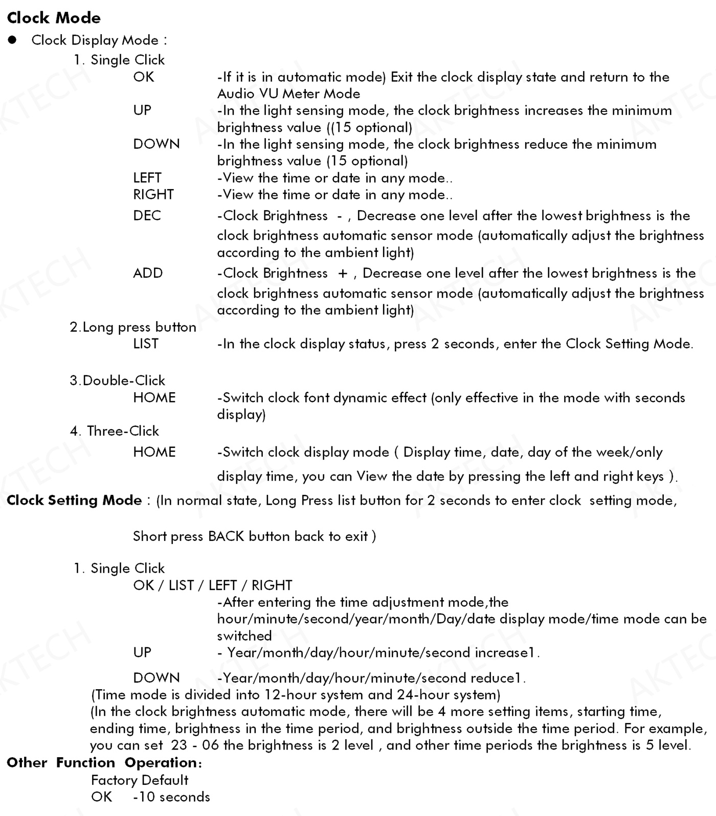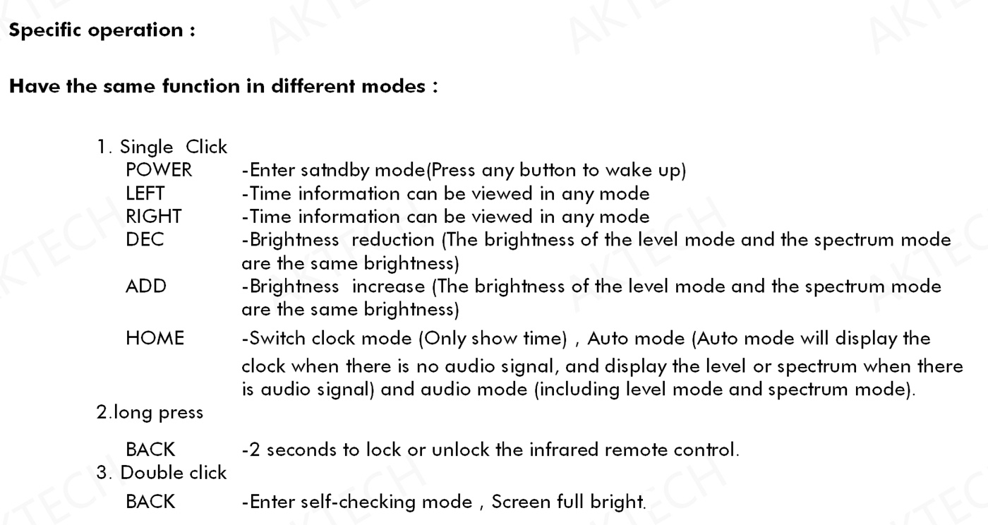 5. The upper, middle and lower parts of the remote control correspond to the Up, OK and Down buttons on the device. In the non-menu state, users can view the time and date through the left and right buttons of the remote control. MENU is the menu button. The play/pause button on the remote control is the back button (exit the menu from the primary menu or return to the primary menu from the secondary menu).