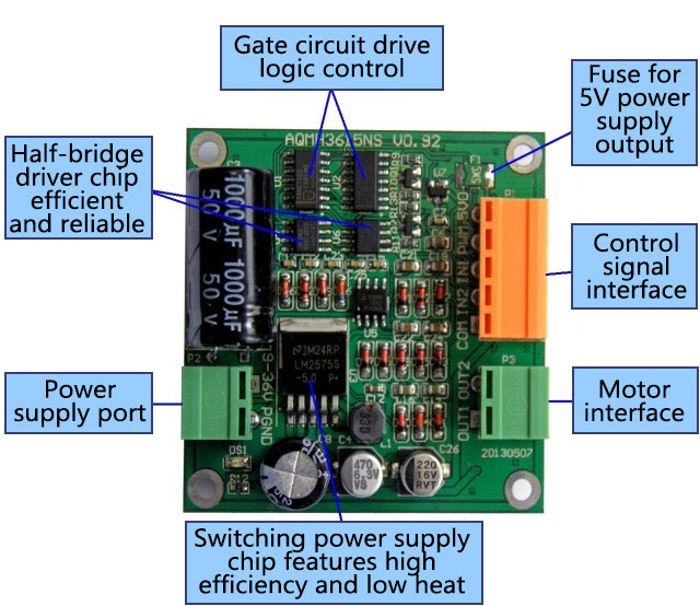 Use a switching power supply chip to provide 5V for the internal circuit of the module, with low heat generation and high efficiency. It supports a wider voltage range; use a half-bridge chip to drive high-power MOS tubes, which are high-rate and reliable.