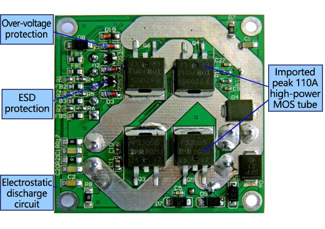 Using imported high-power MOS tube with 110A peak current. Its driving ability is very strong to drive motor.