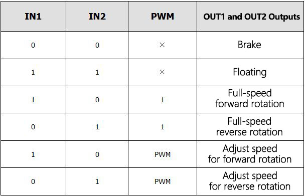 COM is the signal ground, and 5VO is the 5V output, which can provide 5V power supply for MCUs and other controllers. The PWM pin can be connected with PWM. If the button control mode is used, the PWM pin should be connected with 5VO. IN1 and IN2 are two-way motor forward and reverse, brake (or brake) control signals. The control logic is as follows. Among them, 0 is low level, 1 is high level, X is any level, and it is low level when floating.