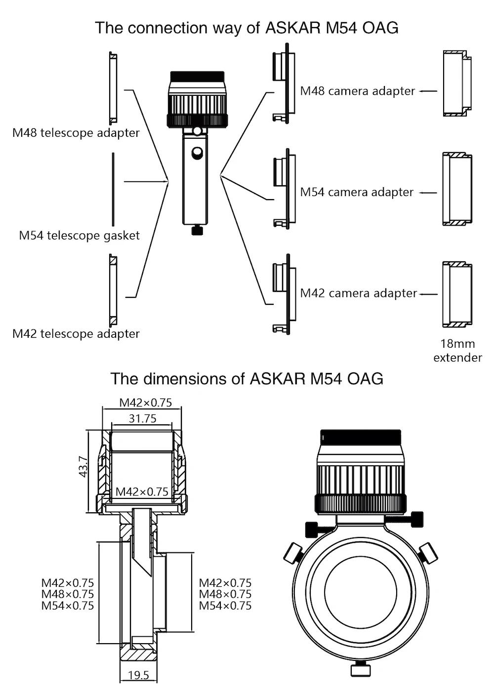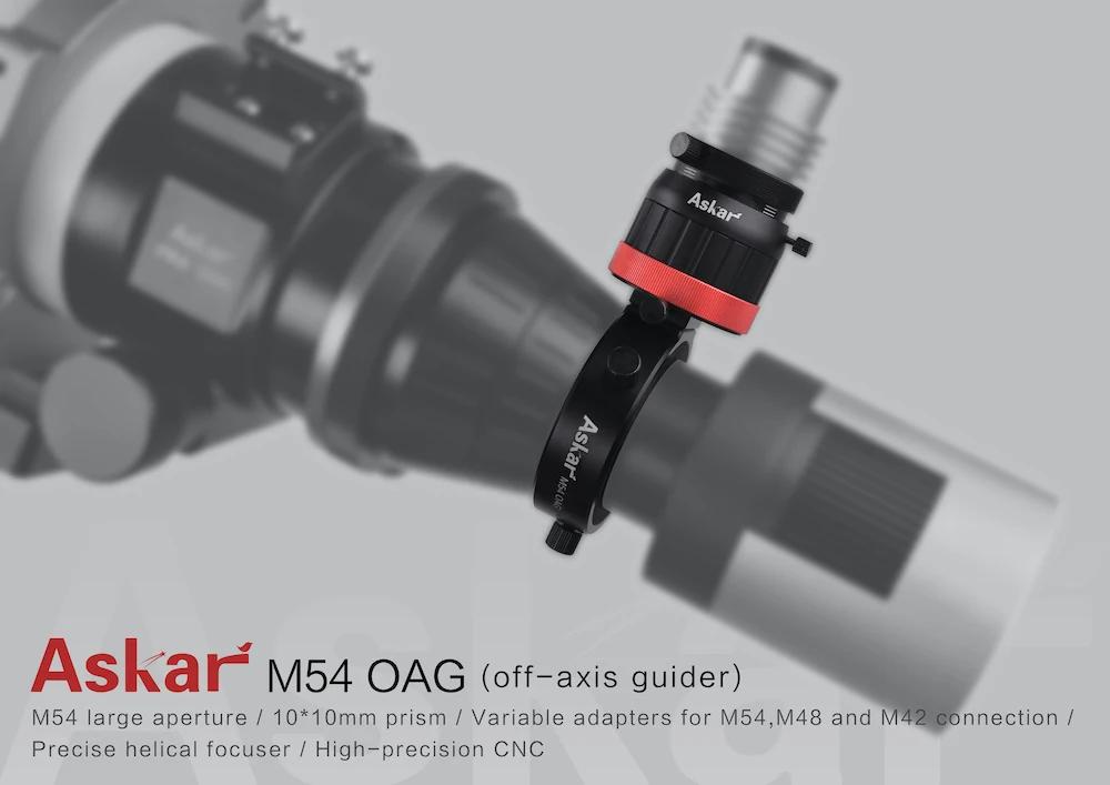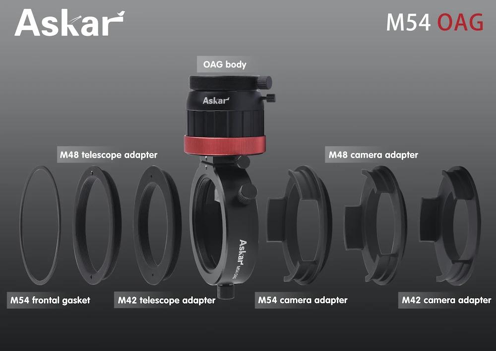 - Askar M54 OAG is designed with multiple threads, like M42, M48 and M54, which can basically satisfy the needs of accessory attachment. These novice-friendly adapters are easy to switch and replace. Askar M54 OAG functions well with a full-frame camera, better facilitating the imaging process of astrophotographers. Askar M54 OAG is CNC machined. The surface of the device is solid and smooth with delicate matte black finish.