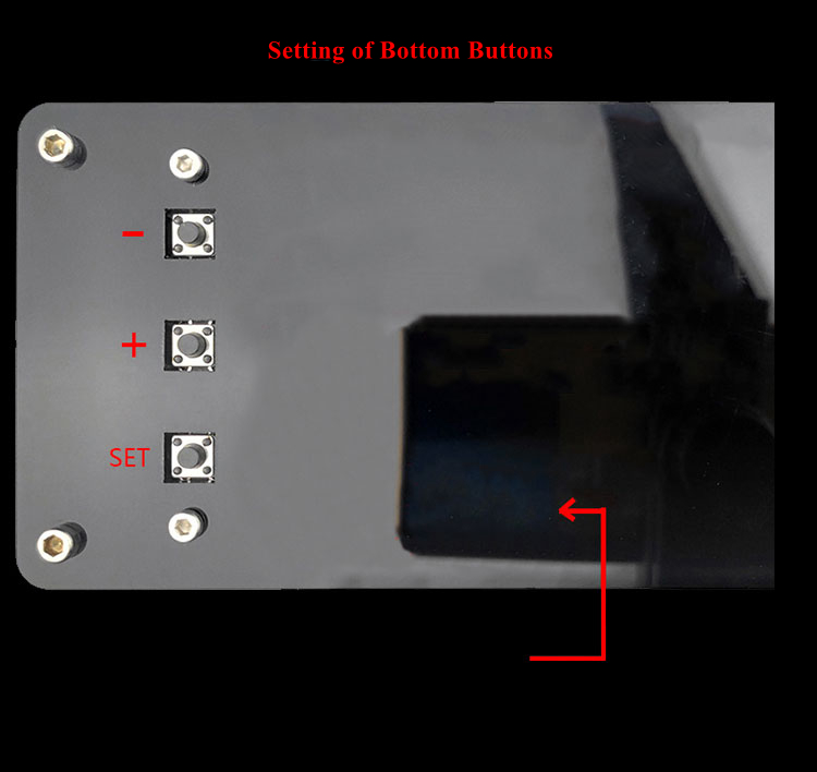 2. Adjust Time: Press and hold SET button for about 5s to enter setting state. Press +/- button to adjust the number in the hour position. Then short press SET button to switch to the minute, press +/- button to adjust the number in the minute position. Then short press SET button to switch to the second, and then press +/- button to adjust the number in the second position. Press SET again to exit setting.
