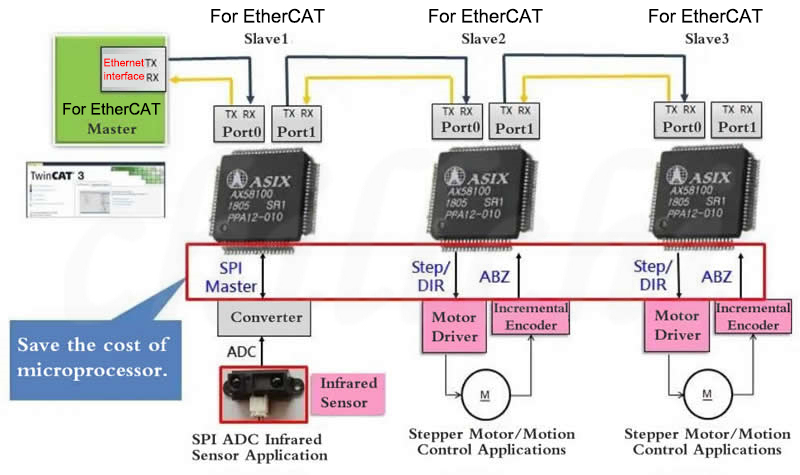AX58100 has integrated two high-speed Ethernet PHY that can support both fiber and copper network applications and supports some additional control interfaces such as pulse width modulation (PWM) interface, incremental (ABZ)/Hall encoder interface, SPI Master interface, 32 digital control I/O, I/O watchdog, emergency stop input and more. It allows customers to easily design the AX58100 in a variety of industrial Ethernet field-bus product applications for EtherCAT without the need for additional microprocessors.