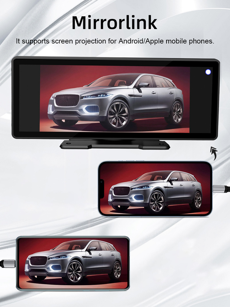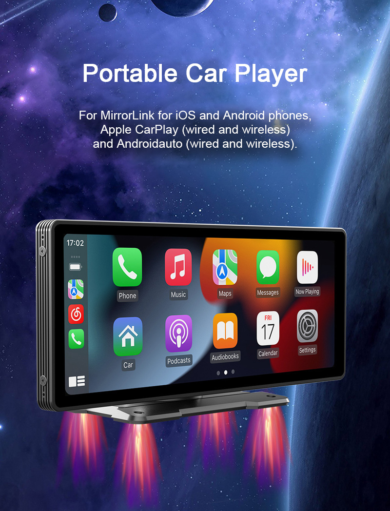 - Portable car player with a wide screen. It supports for MirrorLink for iOS and Android phones, Apple CarPlay (wired and wireless) and Androidauto (wired and wireless).