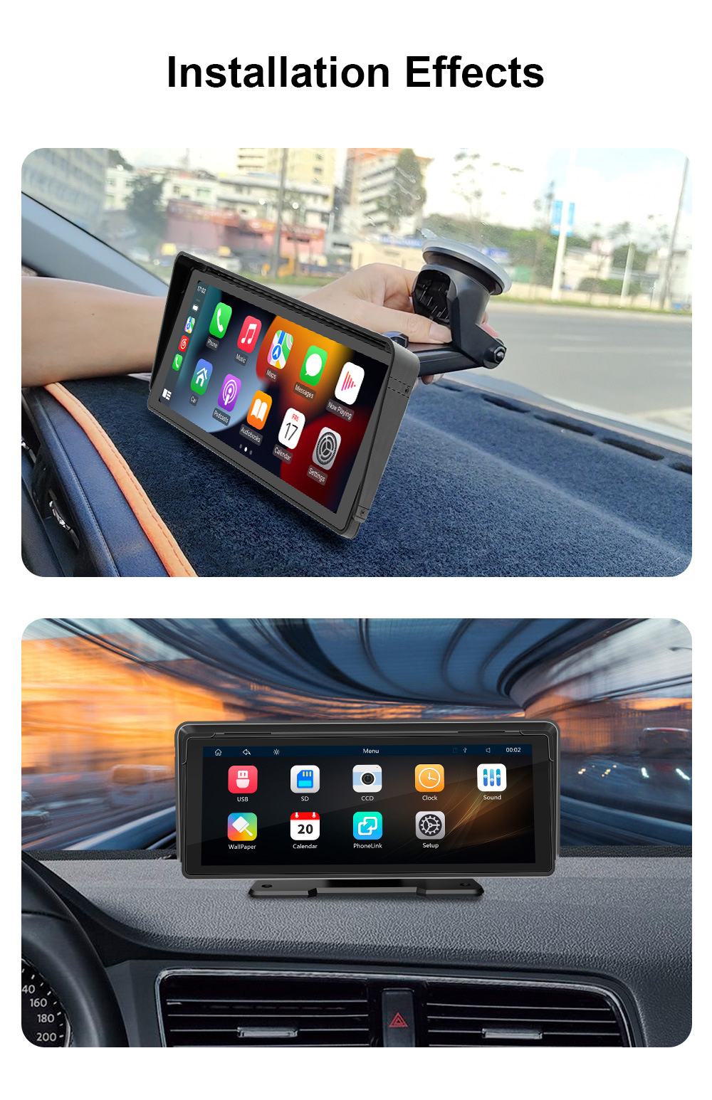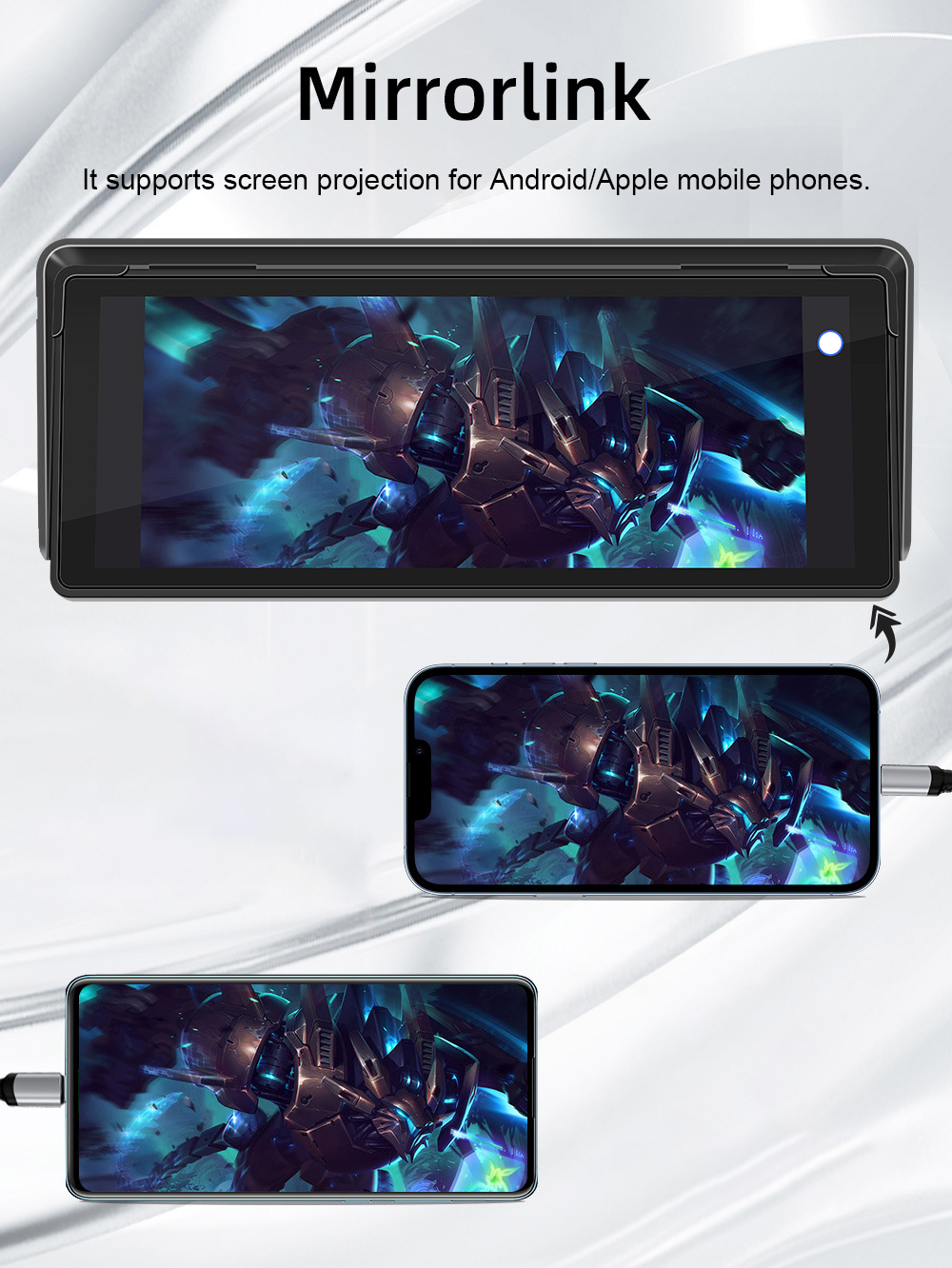 - Portable car player with a wide screen. It supports for MirrorLink for iOS and Android phones, Apple CarPlay (wired and wireless) and Androidauto (wired and wireless).