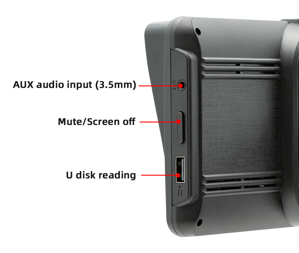 - AUX audio cable output: Connect a 3.5mm audio cable to transmit sound to the original car loudspeaker.