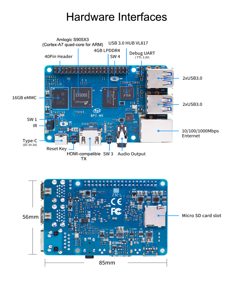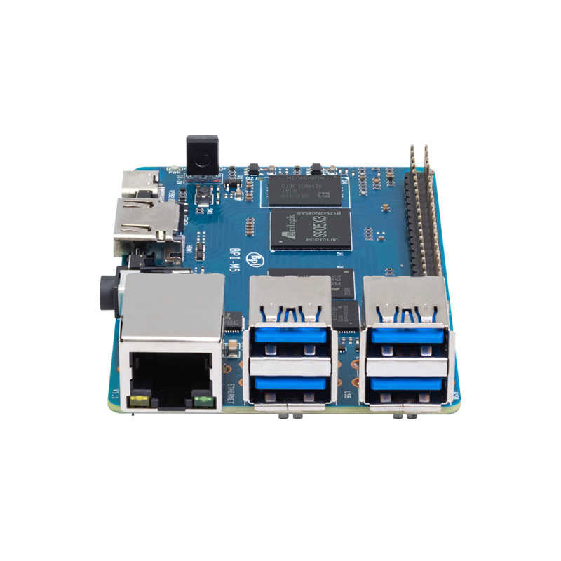 The Banana Pi BPI-M5 is a next-generation single-board computer powered by the Amlogic S905X3 quad-core Cortex-A55 (2.0xxGHz) processor. With MP2 GPU (650Mhz), it supports 4GB LPDDR4 and 16G eMMC onboard storage. It has 4 USB 3.0 ports and 1 Gigabit Ethernet port.