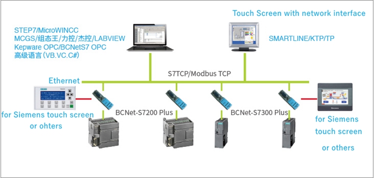 - BCNet-S7300Plus is an advanced version of BCNet-S7300. On the basis of BCNet-S7300, the Ethernet port has added support for communication function between PLC for Siemens with network ports (S7-200SMART, S7-1200/S7-1500, S7300PN, CP243-1/CP343-1/CP443-1) and ModbusTCP master slave communication.