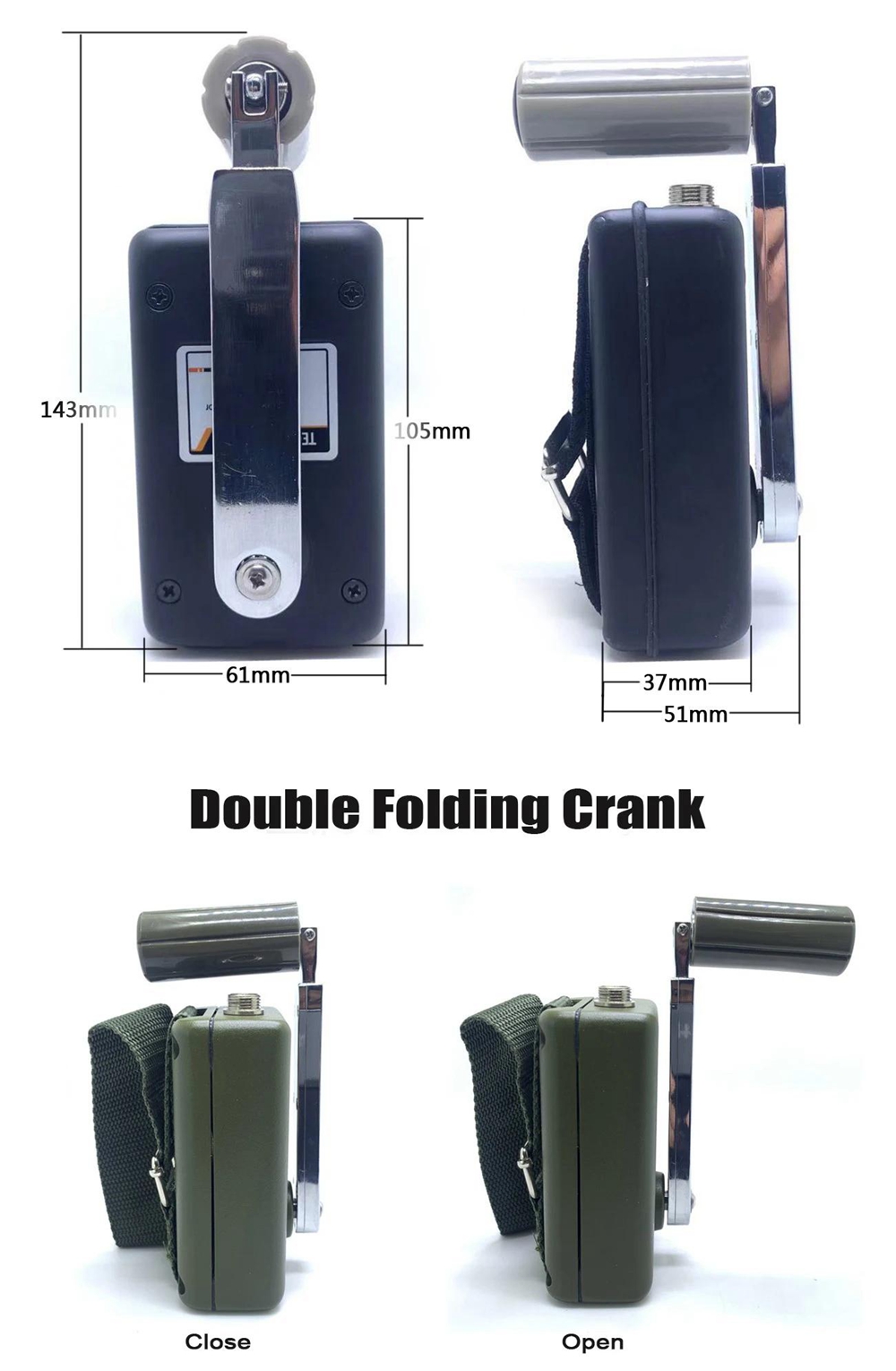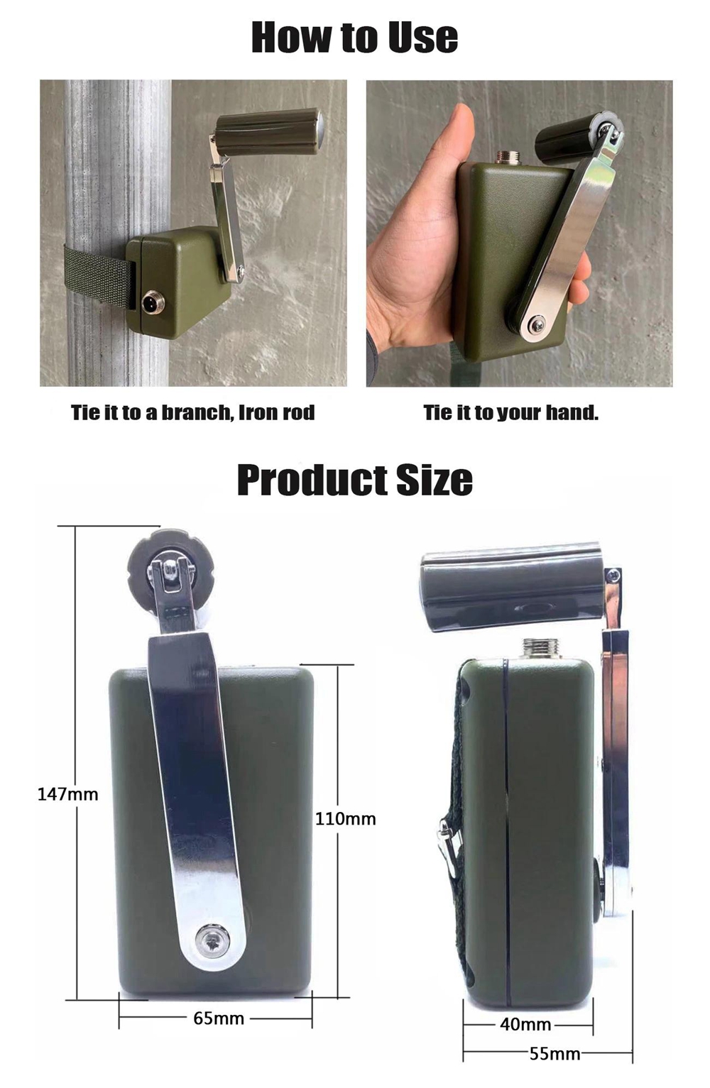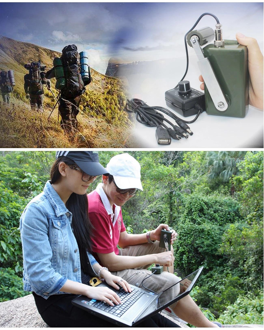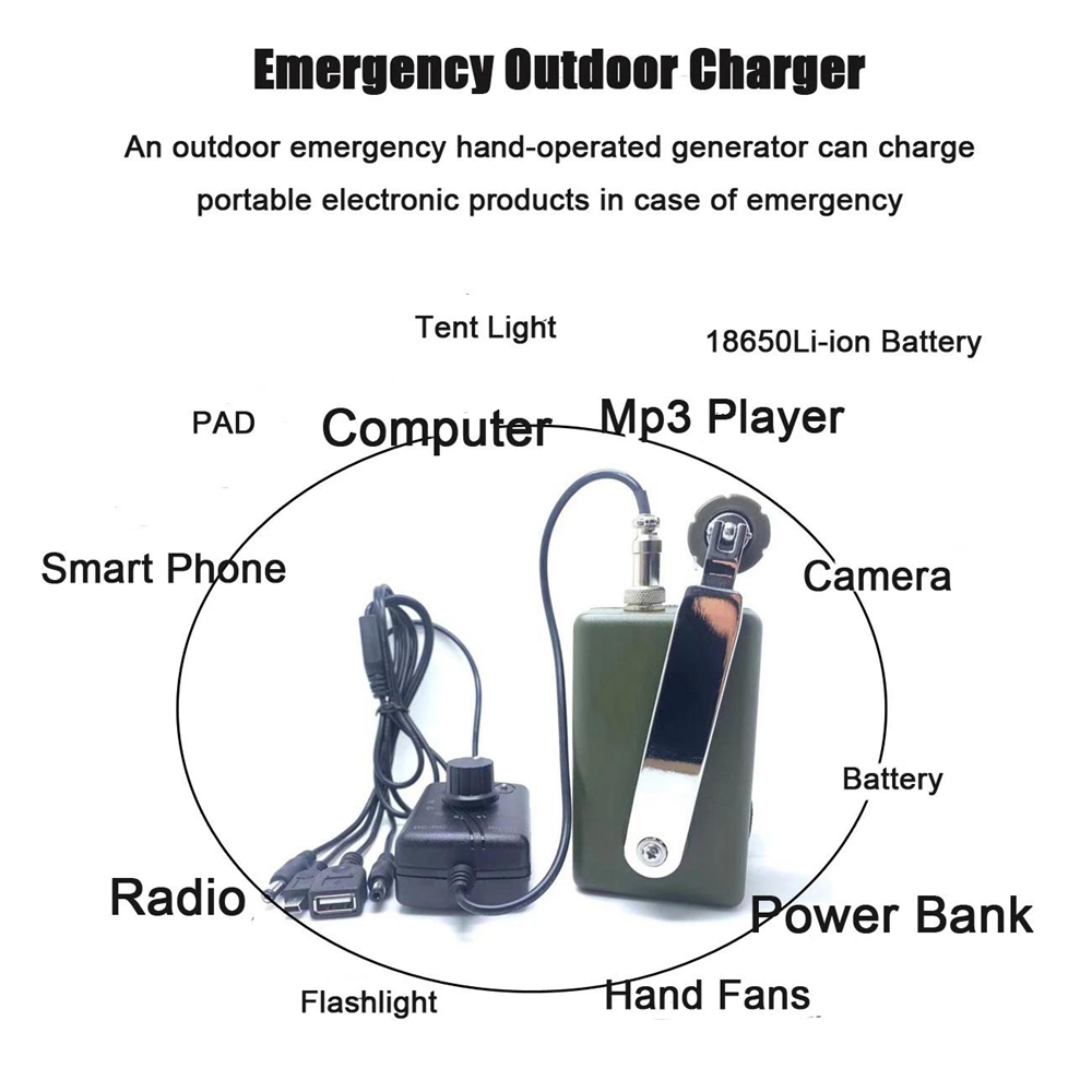 - This hand crank generator is designed to perform as an emergency power supply. It has valuable applications in a variety of conditions, including fighting forest fires, earthquake devastation, survival conditions, emergency communication, long term power disruptions, outdoor activities, geological exploration and marine vessels, etc. In areas without electricity or fuel for electrical power generation, this generator can supply power to different electronic products. It is suitable for low-power radio, interphone, laptops, mobile phones, CD players, M3-4 players, mobile TVs etc. It is also able to directly charge rechargeable lithium, nickel-metal hudride and lead-acid batteries, etc.