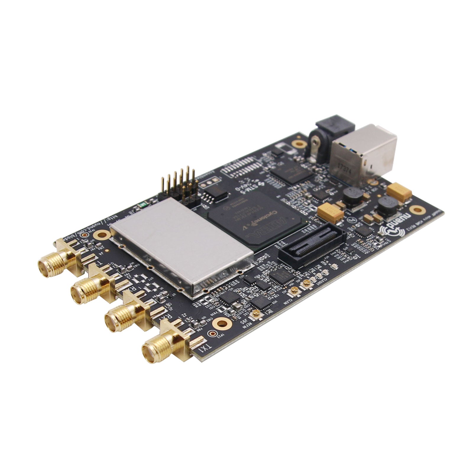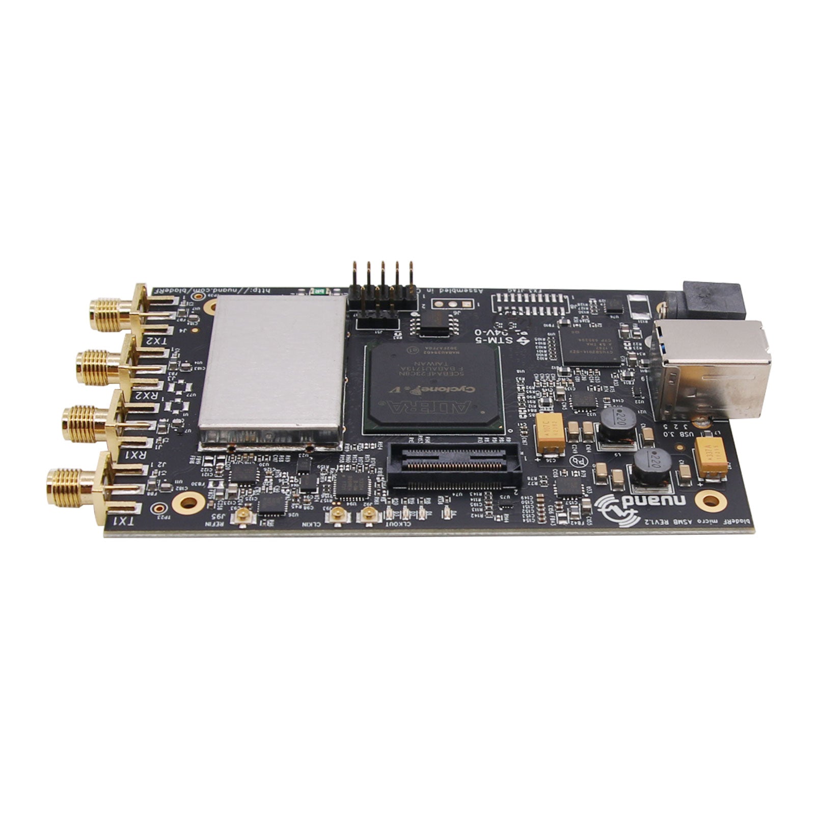 At the core of the bladeRF 2.0 micro is the latest generation Cyclone V FPGA from Intel (formerly Altera). The xA4 features a 49KLE FPGA of which 38KLE are free and user programmable. Optionally, to accelerate modems in HDL and for additional FPGA space, consider the bladeRF xA9, which features the largest-in-class FPGA of any single SDR with 301KLE of which 294KLE are free and user programmable.
