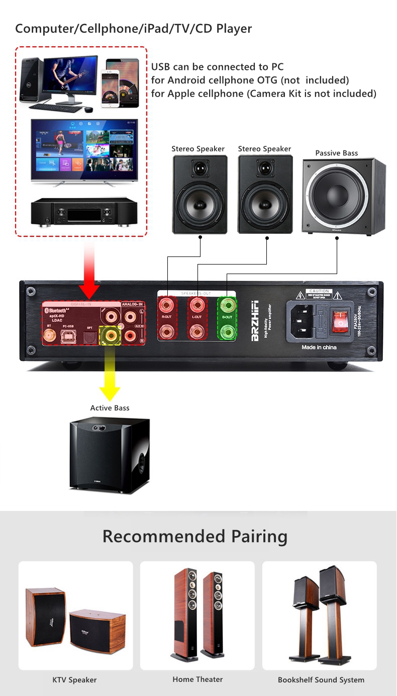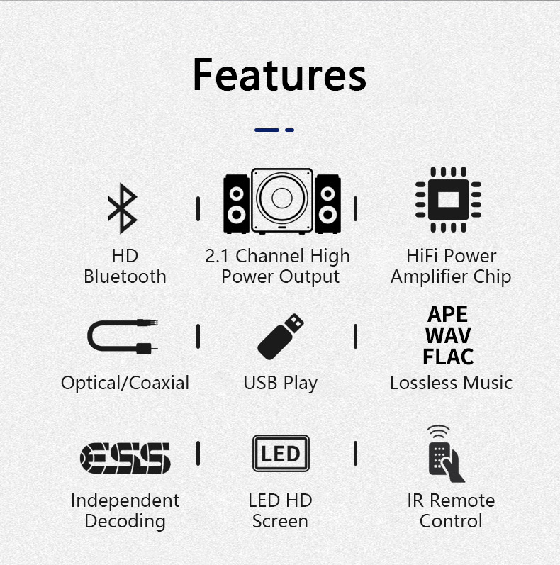 - Signal input: PC-USB/optical/coaxial/RCA/Bluetooth/USB Flash Drive