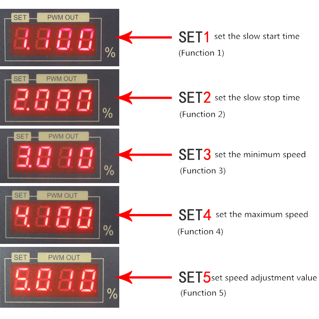 Function 1: "000"-"100", slow start to 100% speed time is adjustable between 0-10.0 seconds, the default is 1 second.