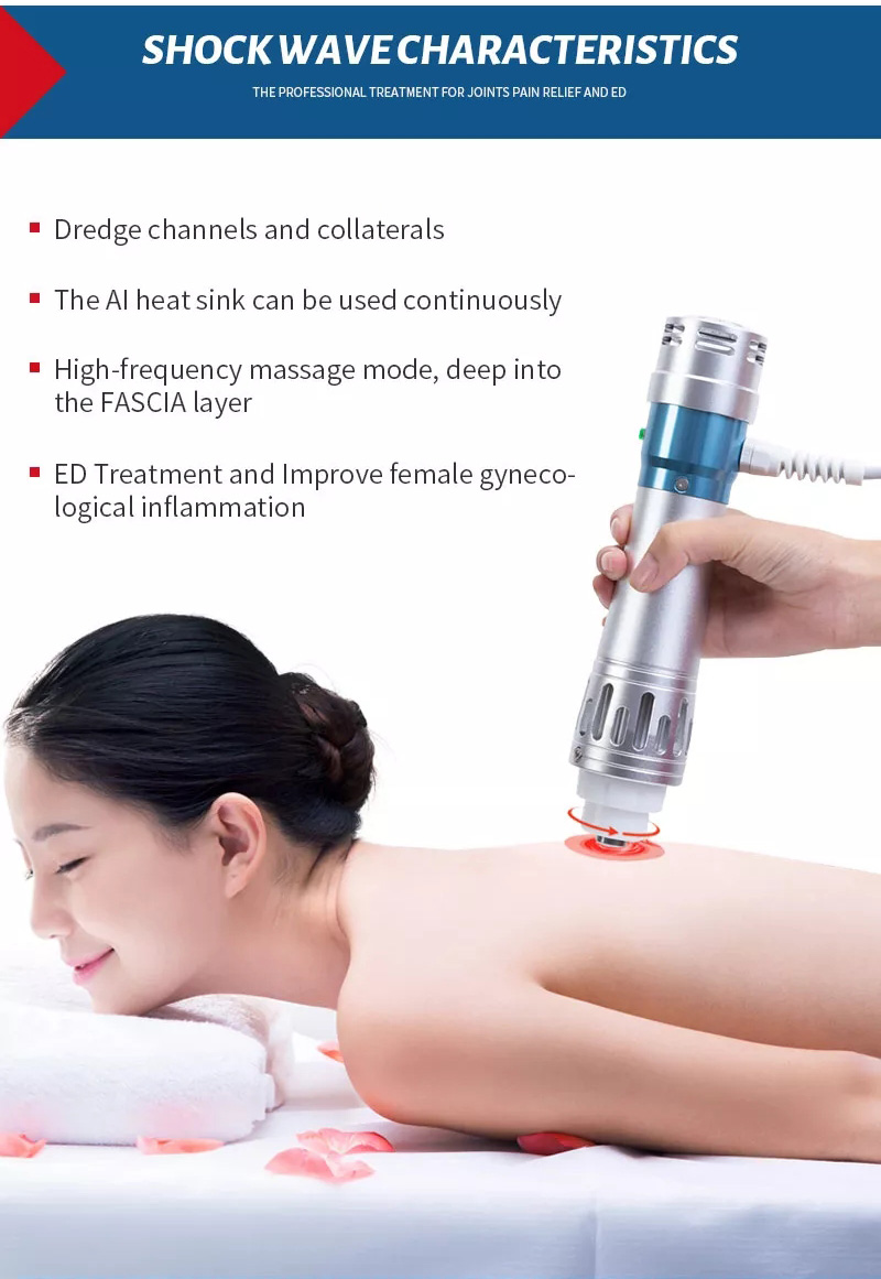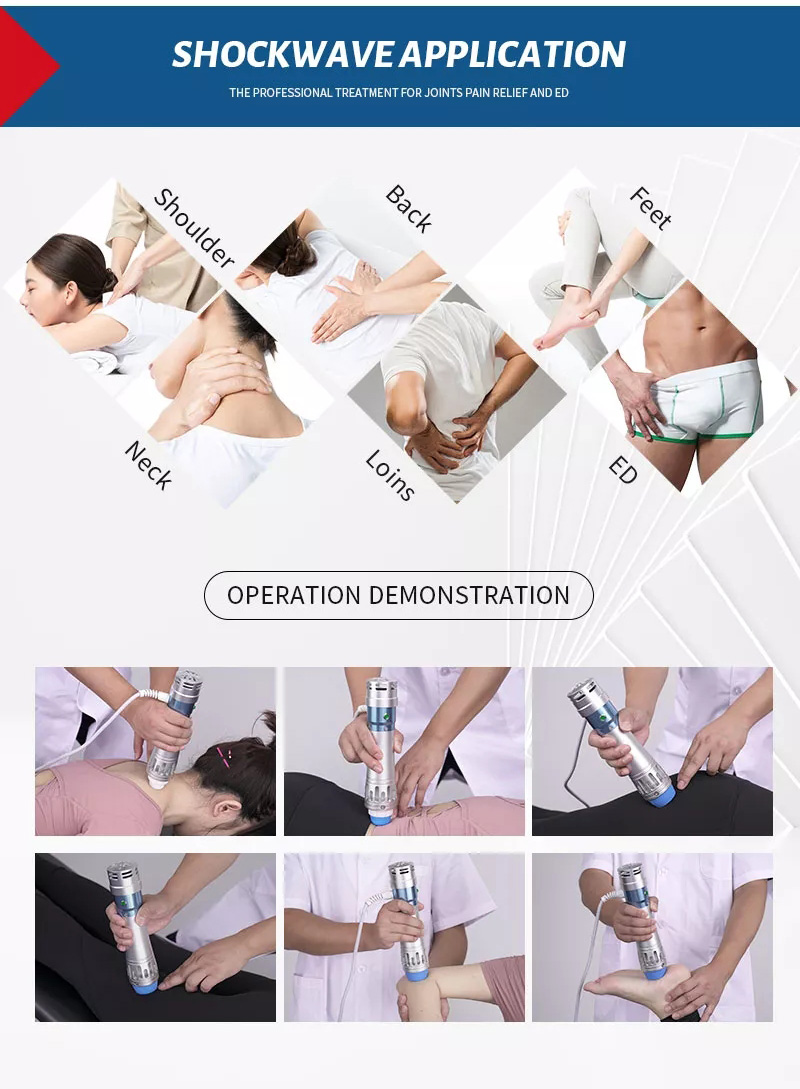 1.Shock wave pain therapeutic apparatus is a physics mechanism through the medium (air or gas) conduction of mechanical wave pulse pressure, produced by pneumatic pulse sound waves into precise ballistic shock wave, movement and positioning of probe through therapy, can happen to pain from a wide range of human tissue have good treatment effect.