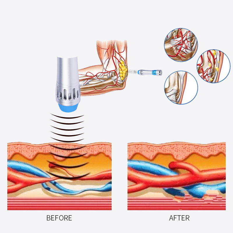 2.Shock wave can change the chemical environment of the injury site, making the tissues produce and release pain-inhibiting chemicals. Meanwhile, shock wave can destroy the membrane of pain receptor, inhibit the production and propagation of pain signals. In addition, shock wave causes the production of endorphin, reducing the sensitivity of the injury site to pain.