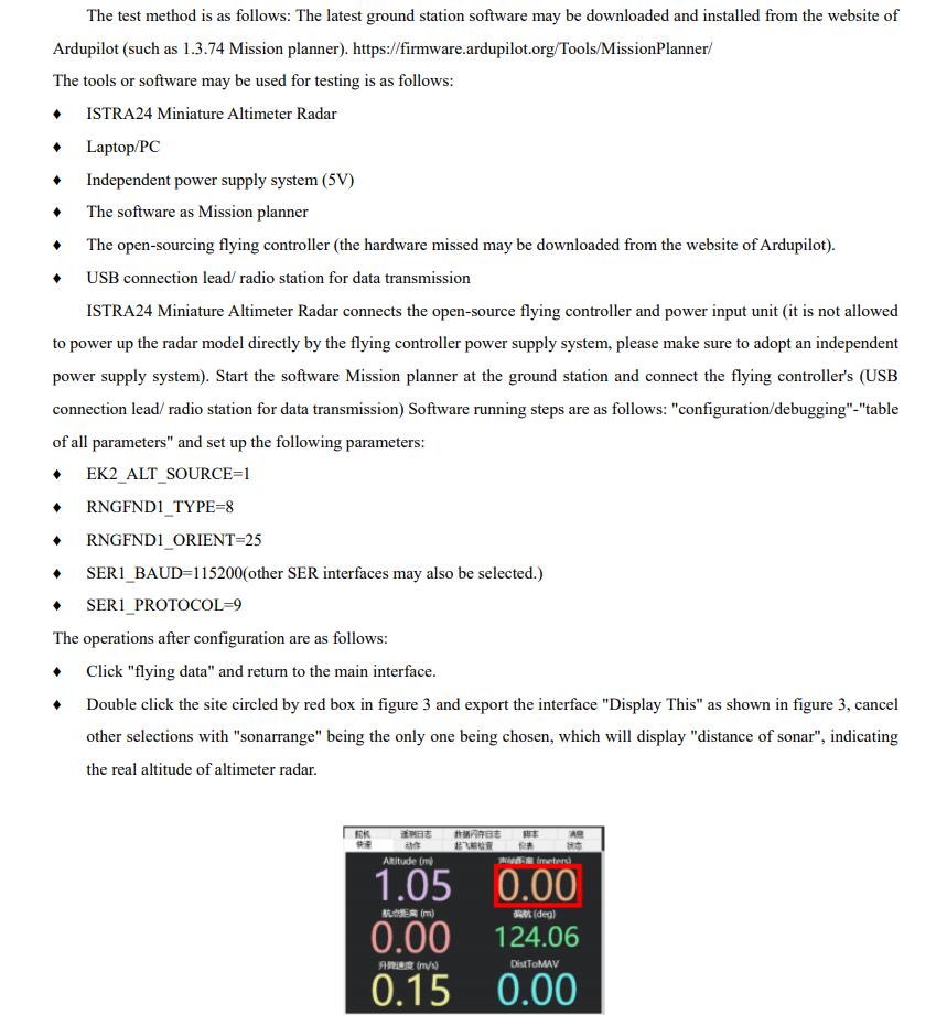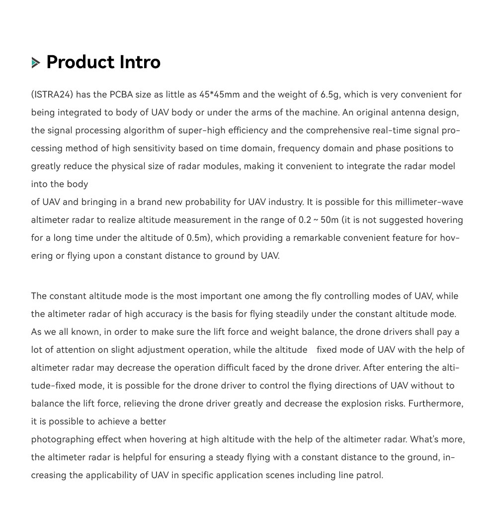 The 24GHz Miniature UAV Altimeter Radar (ISTRA24) has the PCBA size as little as 45*45mm and the weight of 6.5g, which is very convenient for being integrated to body of UAV body or under the arms of the machine.