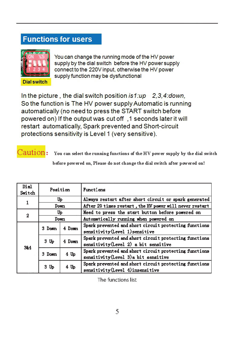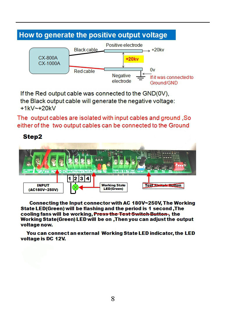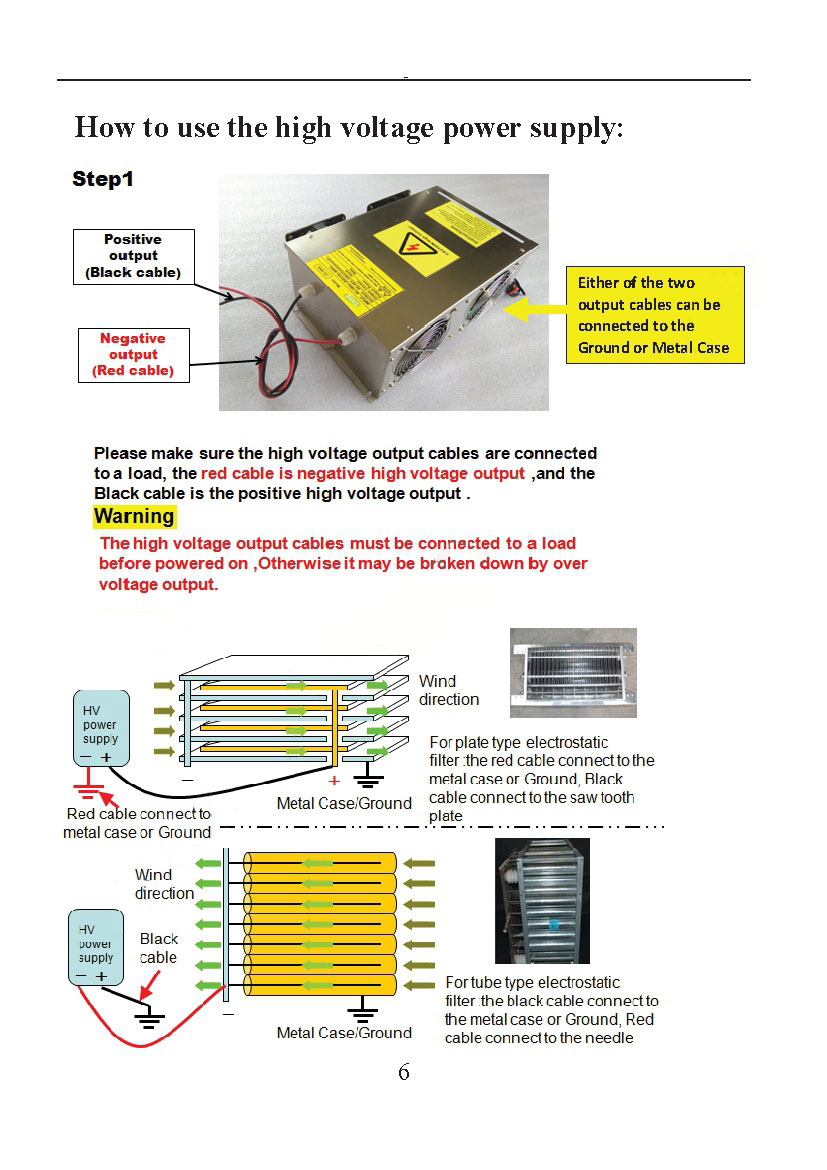 1. This high-voltage power supply cannot work without load. Please connect the load (electric field of the purifier) before powering on. Although the power supply has the function of open-circuit protection, it cannot guarantee 100% effective protection due to the large power of the power supply. It may cause damage to the power supply!