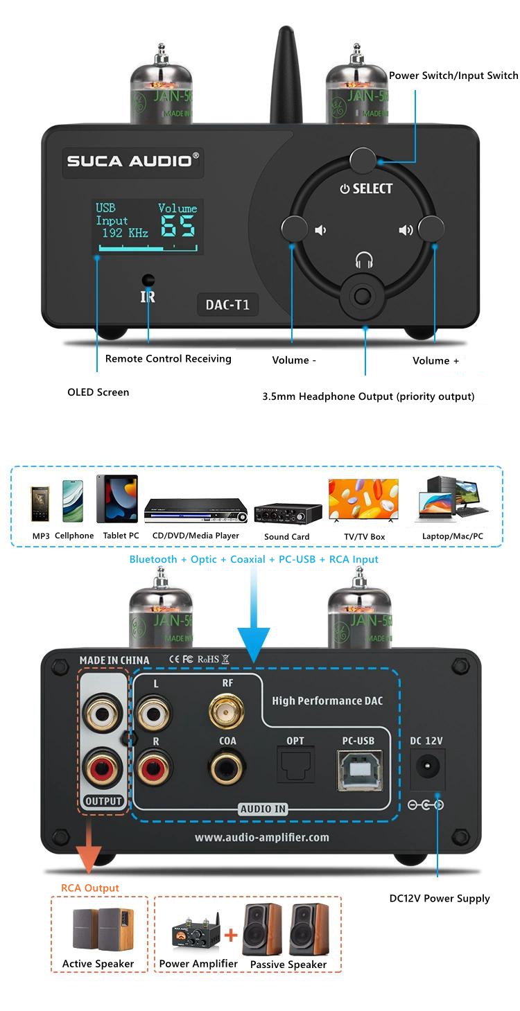- Multiple function input: 24 bit 192KHz USB audio input, and support driver free use. This machine also has Bluetooth, fiber optic, coaxial, and RCA analog signal input, with a total of 5 input methods, two output RCA and 3.5mm headphone jack.