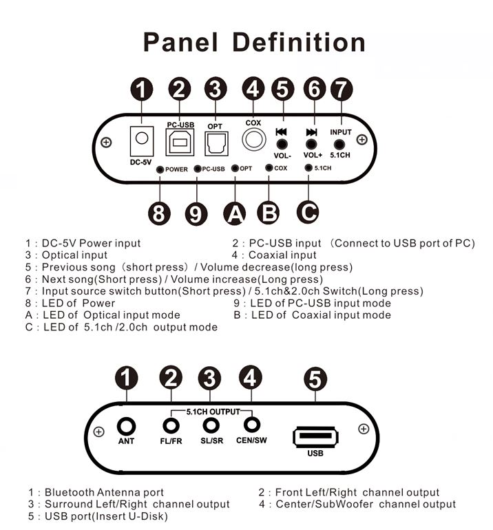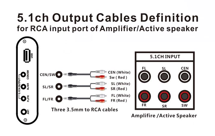 - Support 5.1ch/2.0ch output mode selection, FL/FR active when 2.0ch output mode.