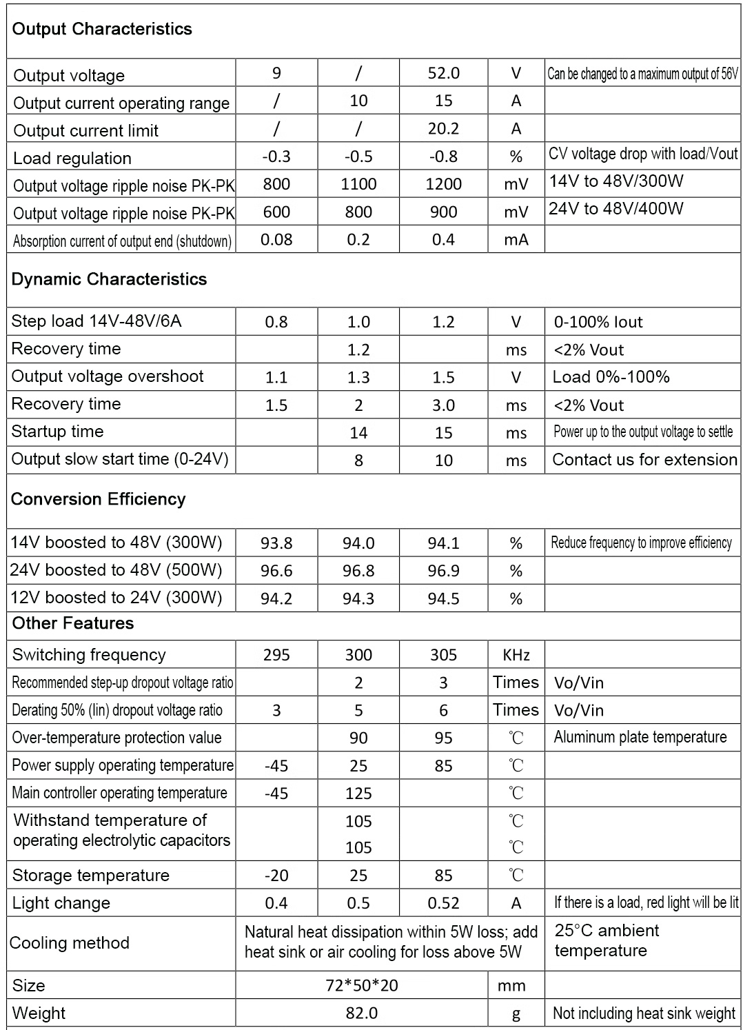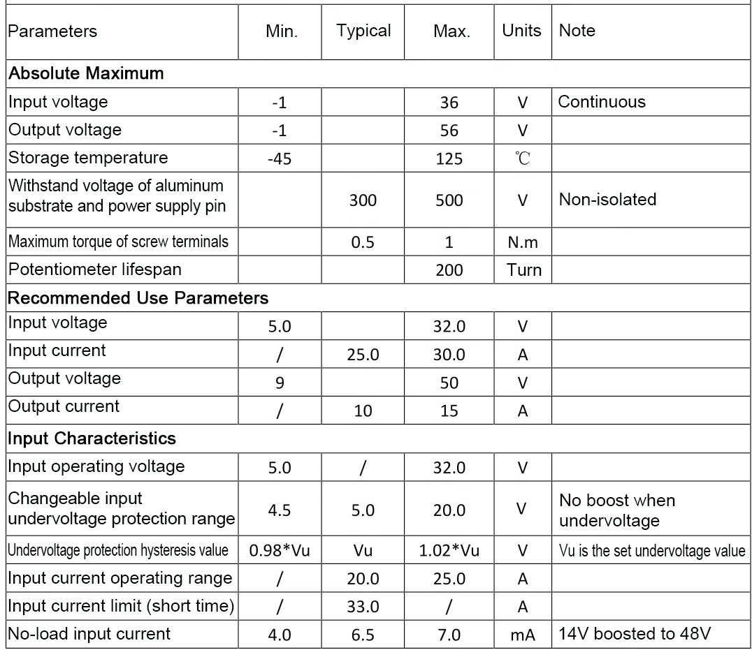 2: The input and output voltage difference should not be too large, up to 4 times (e.g. 12V boost to 48V)