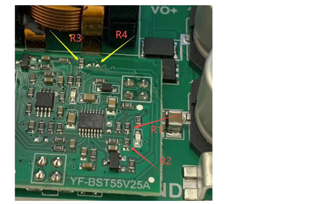 - As shown in the figure, the resistor R3 of the yellow arrow is removed and soldered to the right R4 position, and it can continue to operate when the input voltage drops to 2.5V after starting up operation at 5V. (Note that the undervoltage protection needs to be modified to within 2.5V, and the output voltage setting value should not be greater than 36V.) It is recommended that the maximum output voltage is within 15V).