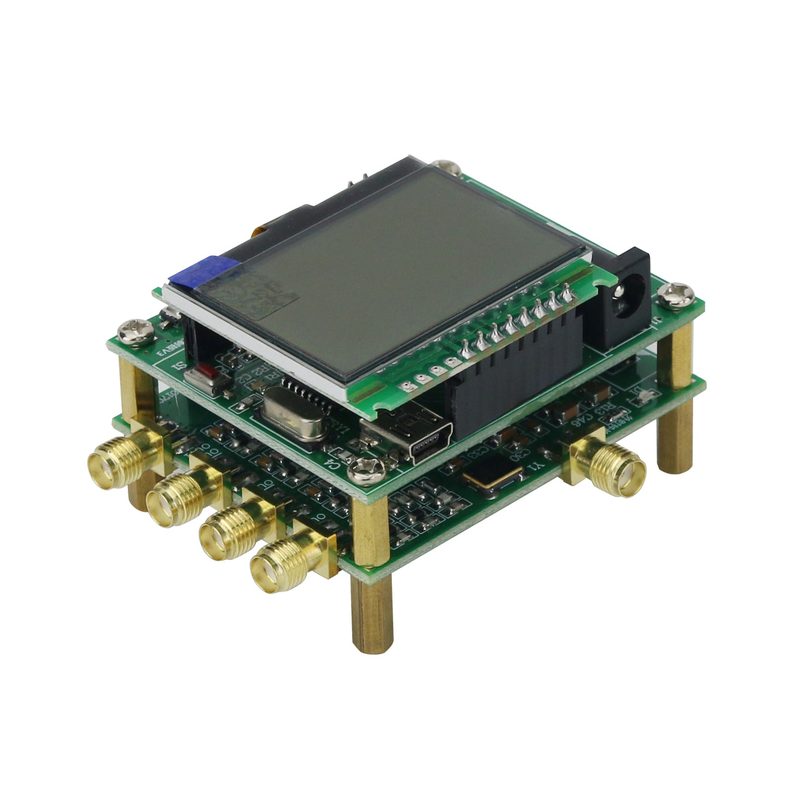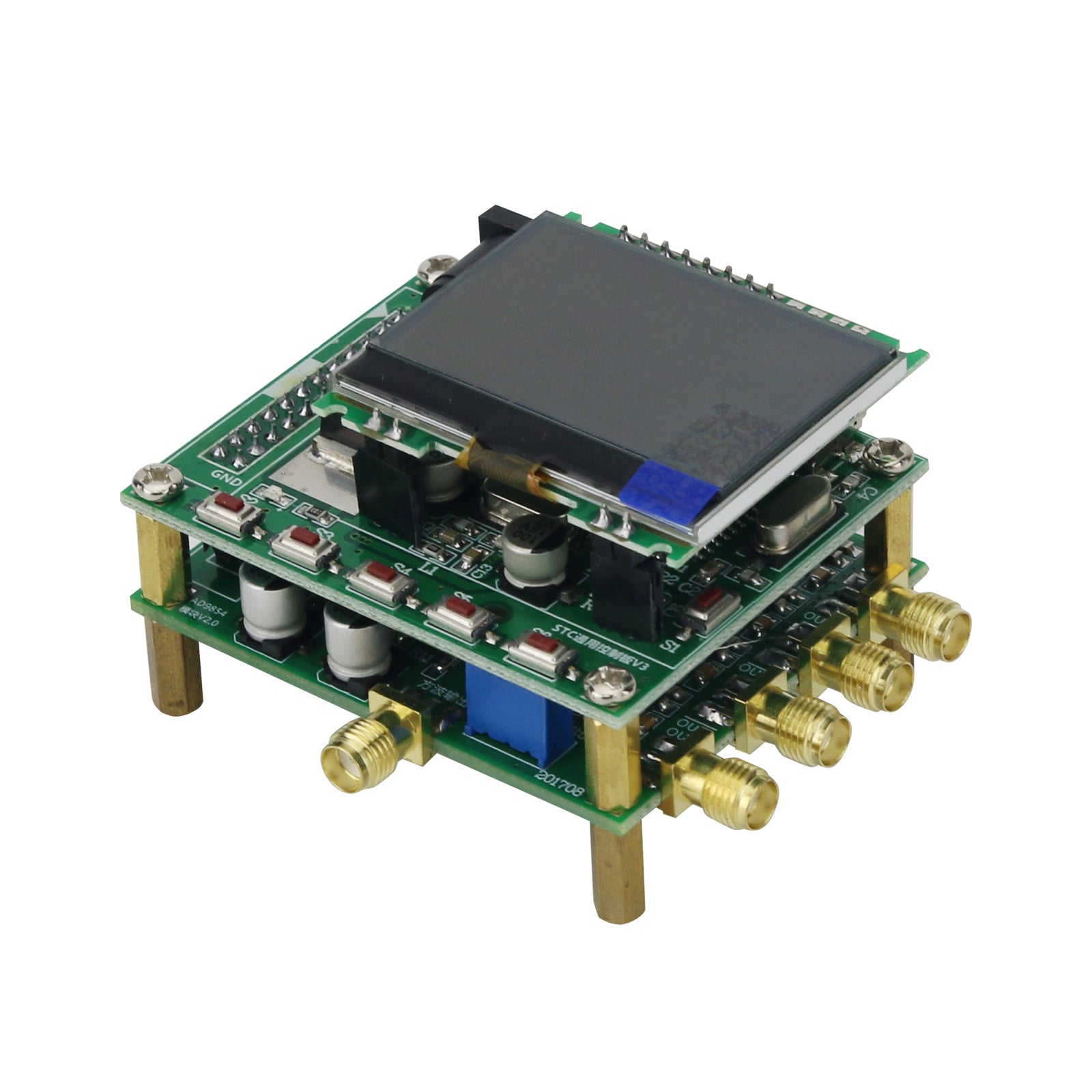 The module is composed of two parts: MCU control board for STC and AD9854ASQ signal board, which are connected through a 24-core pin header. System power supply is on the MCU control board to reduce the interference to DDS signal. The two modules can be fixed together by hexagonal copper columns or can be fixed separately, which is simple and convenient.