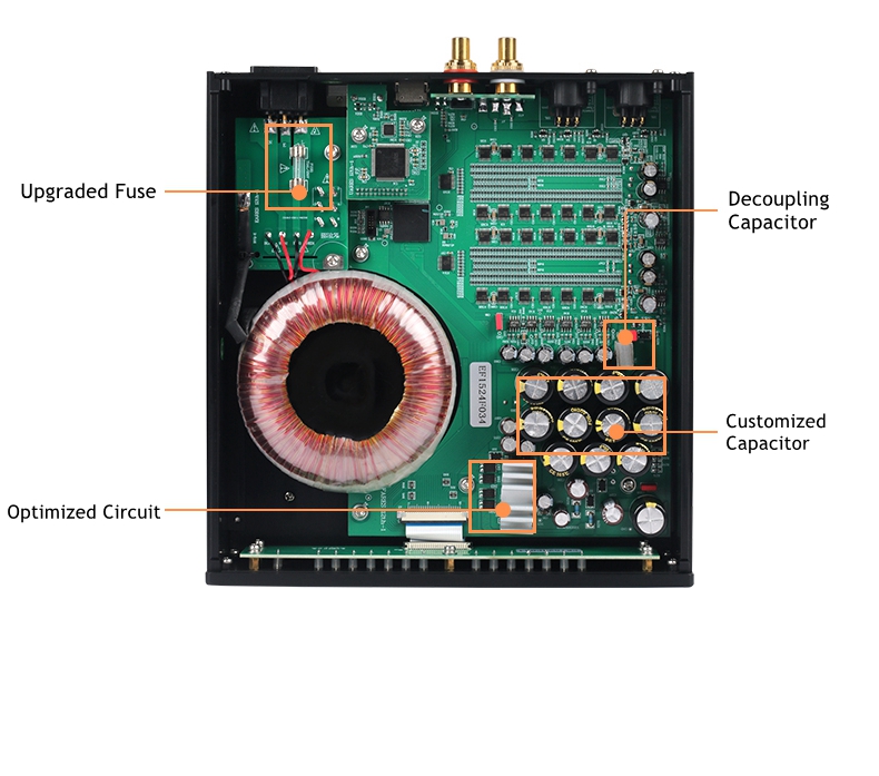 - Capacitor bank: Electrolytic capacitors are customized according to DENAFRIPS specifications. High bias linear power regulator.
