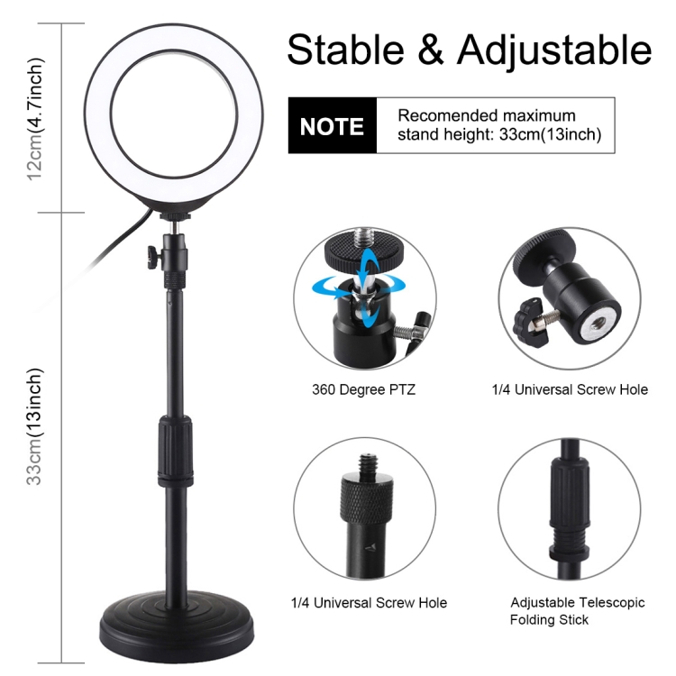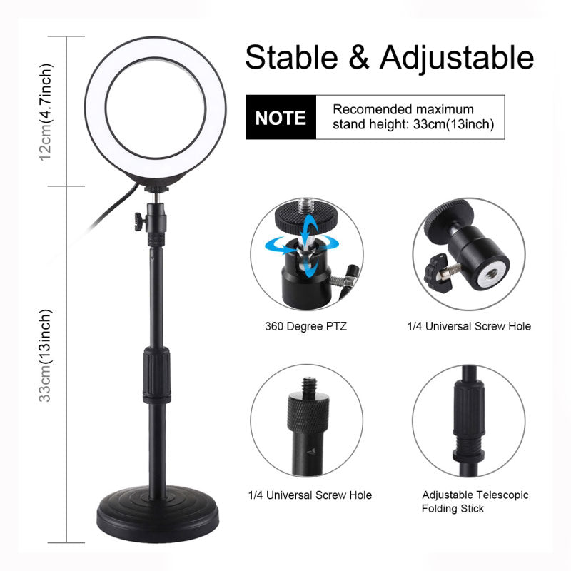 Desktop Tripod Stand Round Base + 4.7" Dimmable LED Ring Light Fill Light Adjustable 18cm-28cm PU391