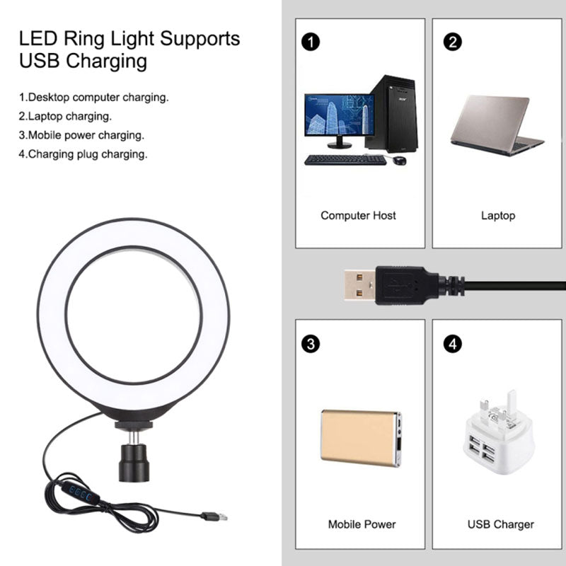 5. The USB ports can be used with multiple devices, such as connect computer host, laptop, mobile power and USB charger. You will be able to enjoy LED ring light at any time free.
