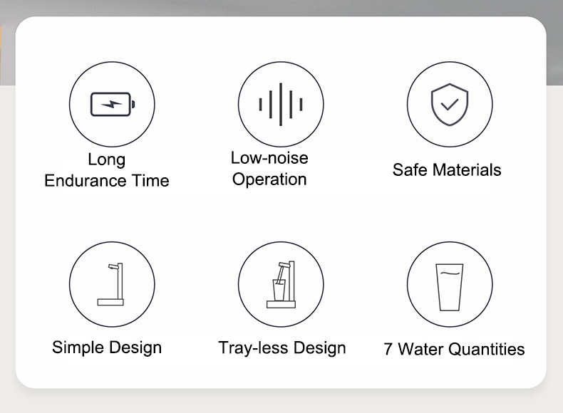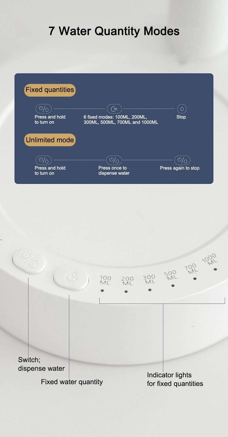 - 7 Water Quantities: Six fixed water volume includes 100ML, 200ML, 300ML, 500ML, 700ML and 1000ML. There is also a unlimited water quantity for choice.